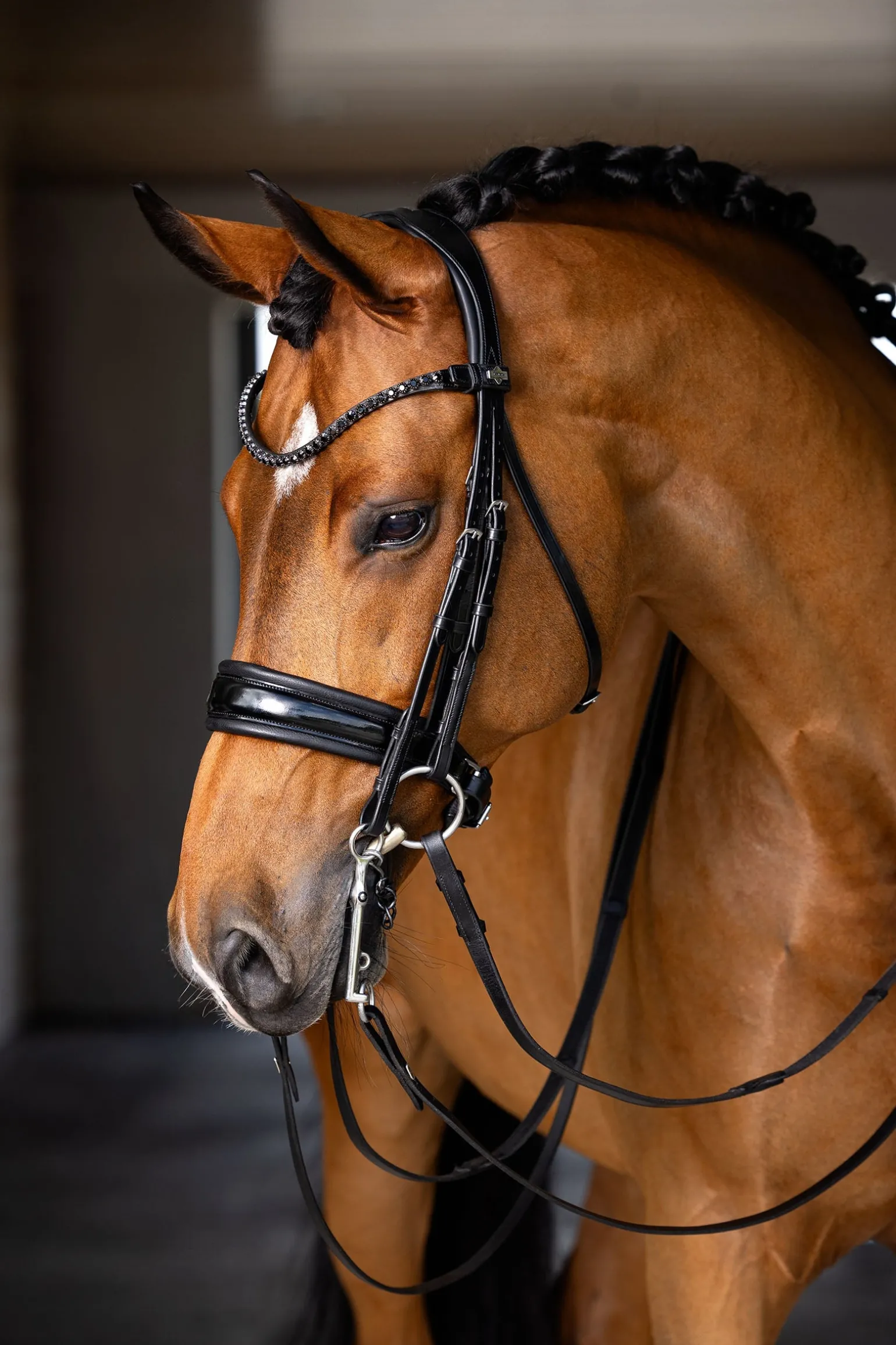 Gefertigt aus hochwertigem, vorgeöltem italienischem Leder, überzeugt diese Kandare mit einem anatomisch geformten, gelgepolsterten Genickstück, das hinter den Ohren für optimale Freiheit sorgt. Das abnehmbare, geschwungene Stirnband mit Kristallen und das gelgepolsterte Reithalfter aus Lackleder verleihen der Trense den unverkennbaren LeMieux-Stil, während der unauffällige Kehlriemen für eine klare Linienführung sorgt. Ein weich gepolsterter Kinnschutz mit Gelauflage rundet den Komfort dieser Premium-Kandare ab.