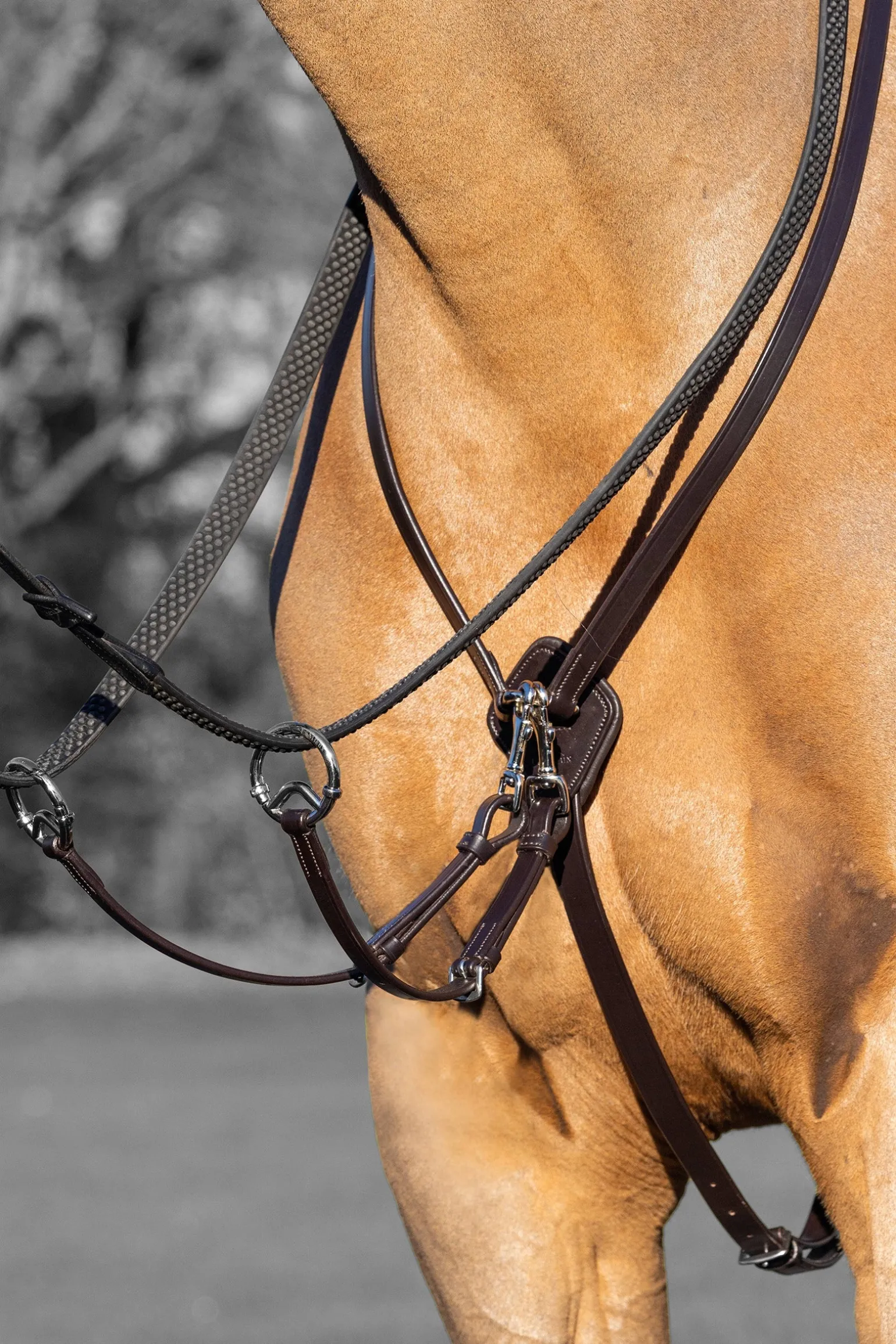 Die speziell entworfenen Martingalringe lassen sich schnell und einfach an- und abschnallen, ohne dass du die Zügel öffnen musst. Die abnehmbaren Zügelbefestigungen können entfernt werden, wenn sie nicht benötigt werden.