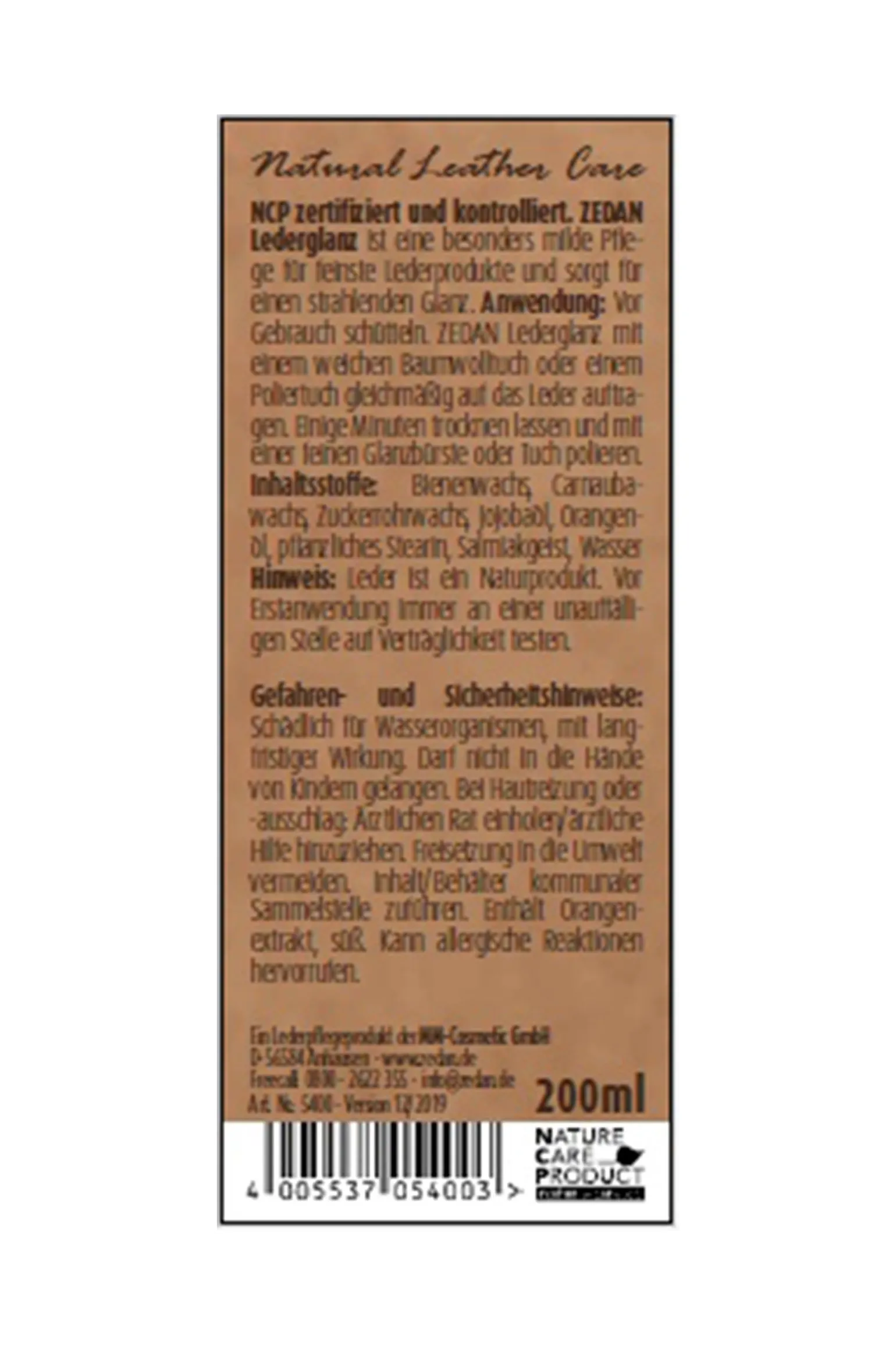 Zedan Lederglanz ist eine besonders milde Pflege für feinste Lederprodukte und sorgt für einen strahlenden Glanz. Wirksame Pflegerezepturen mit ökologischem Mehrwert aus Verantwortung für Tier, Mensch und unsere Umwelt.