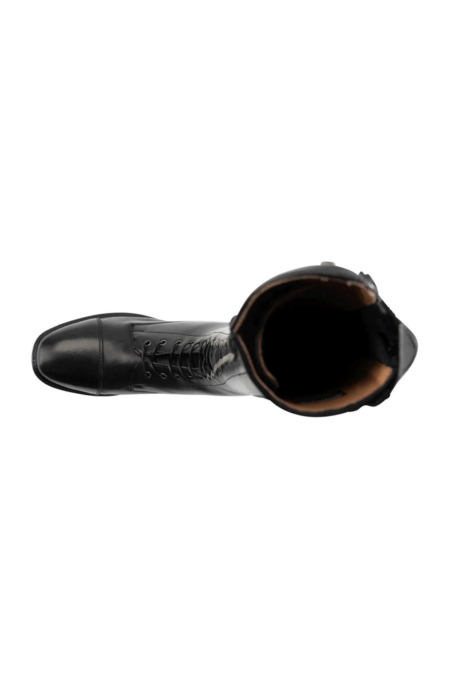 Leitfaden zur Ermittlung der richtigen Größe:Bitte setz dich gerade (barfuß) auf einen Stuhl, dein Knie in einer 90°-Neigung. Bitte eine Reithose und Reitstrümpfe anziehen, die du normalerweise auch zum Reiten tragen würdest. Lass dich idealerweise von einer anderen Person messen.Nun wird gemessen:1. Weite messen: Die Wade misst du an der breitesten Stelle deiner stärkeren Wade. Die Größe in der Größentabelle mindestens einen Zentimeter enger wählen, da sich Leder bei Gebrauch noch etwas dehnt.2. Höhe messen: Miss die Länge (barfuß) von der Ferse bis in die Kniekehle. Dann ca. 2 cm auf die gemessene Länge addieren, da sich der Schaft bei Gebrauch einige Zentimeter setzen wird.Beispiel: Du misst z.B. eine Wadenweite an der breitesten Stelle von 35 cm und eine Wadenhöhe von 46 cm. Du wählst folgende Größe:Weite 35 – 1 = 34 cm.Höhe 46 + 2 = 48 cm.Die richtige Größe in der Größentabelle ist also 34/48.TIPP: Der Schaft muss eng anliegen und etwas länger von der Höhe sein. Das Leder gibt in der Weite mindestens 1 cm nach, in der Höhe wird der Schaft ebenfalls einige Zentimeter sinken. Wir empfehlen deshalb, die ersten Wochen einen Stiefelkeil zu verwenden.