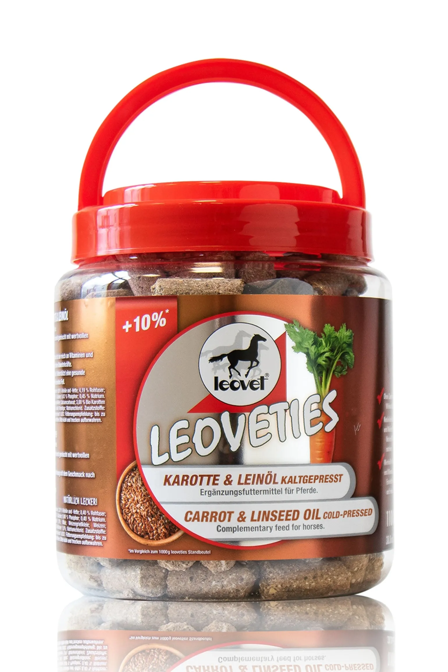 Frei von künstlichen Aromen und voller natürlicher Ballaststoffe, Vitamine und Mineralstoffe. Die leoveties mit Karotte und kaltgepresstem Leinöl sind besonders schmackhaft und in der praktischen, wiederverwendbaren 1100g Dose erhältlich. Fütterungsempfehlung: bis zu 150 g pro Tier und Tag als Belohnung verfüttern.