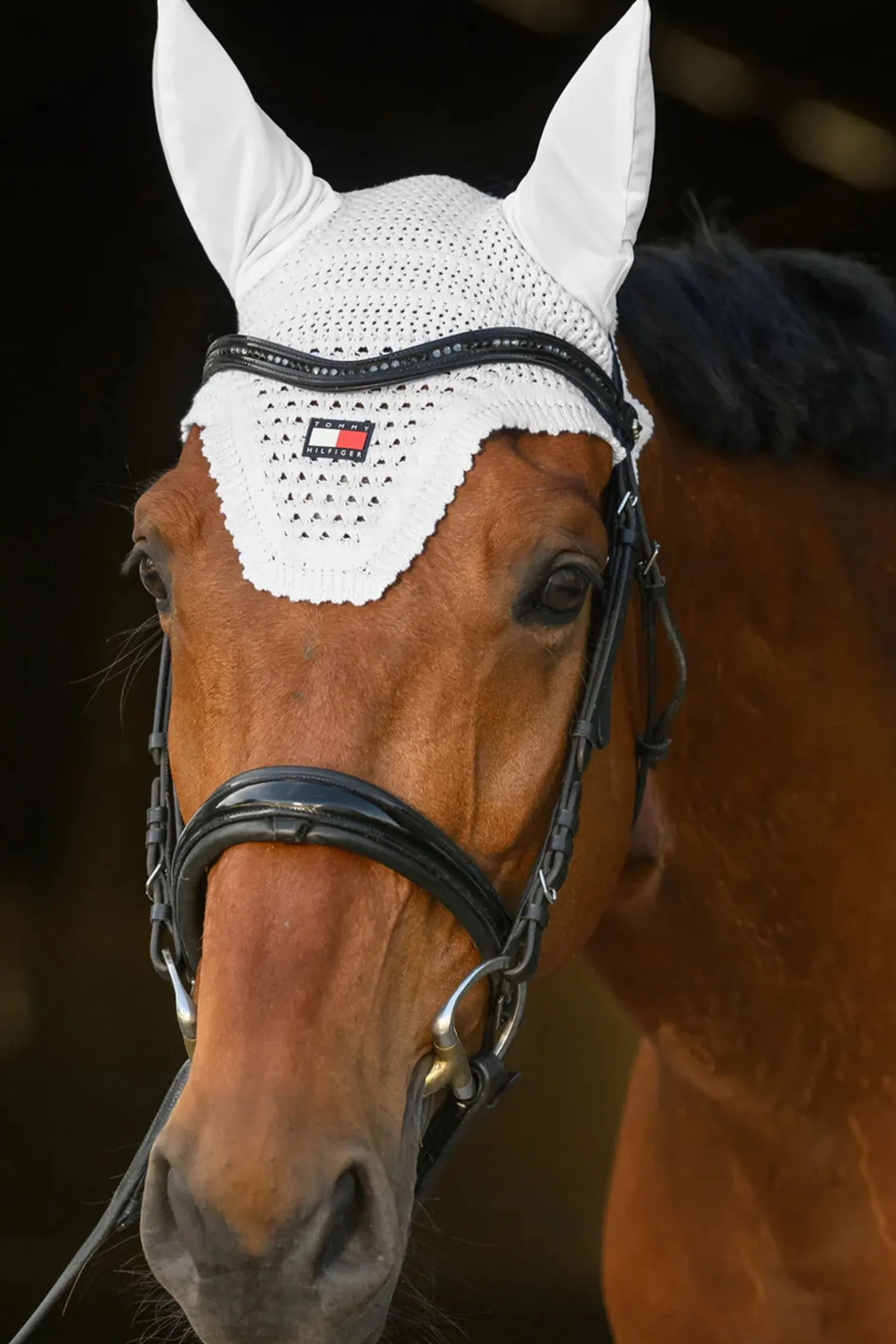 Verpasse deinem Pferd den Tommy Touch mit der gehäkelten Fliegenhaube mit Logo-Patch.