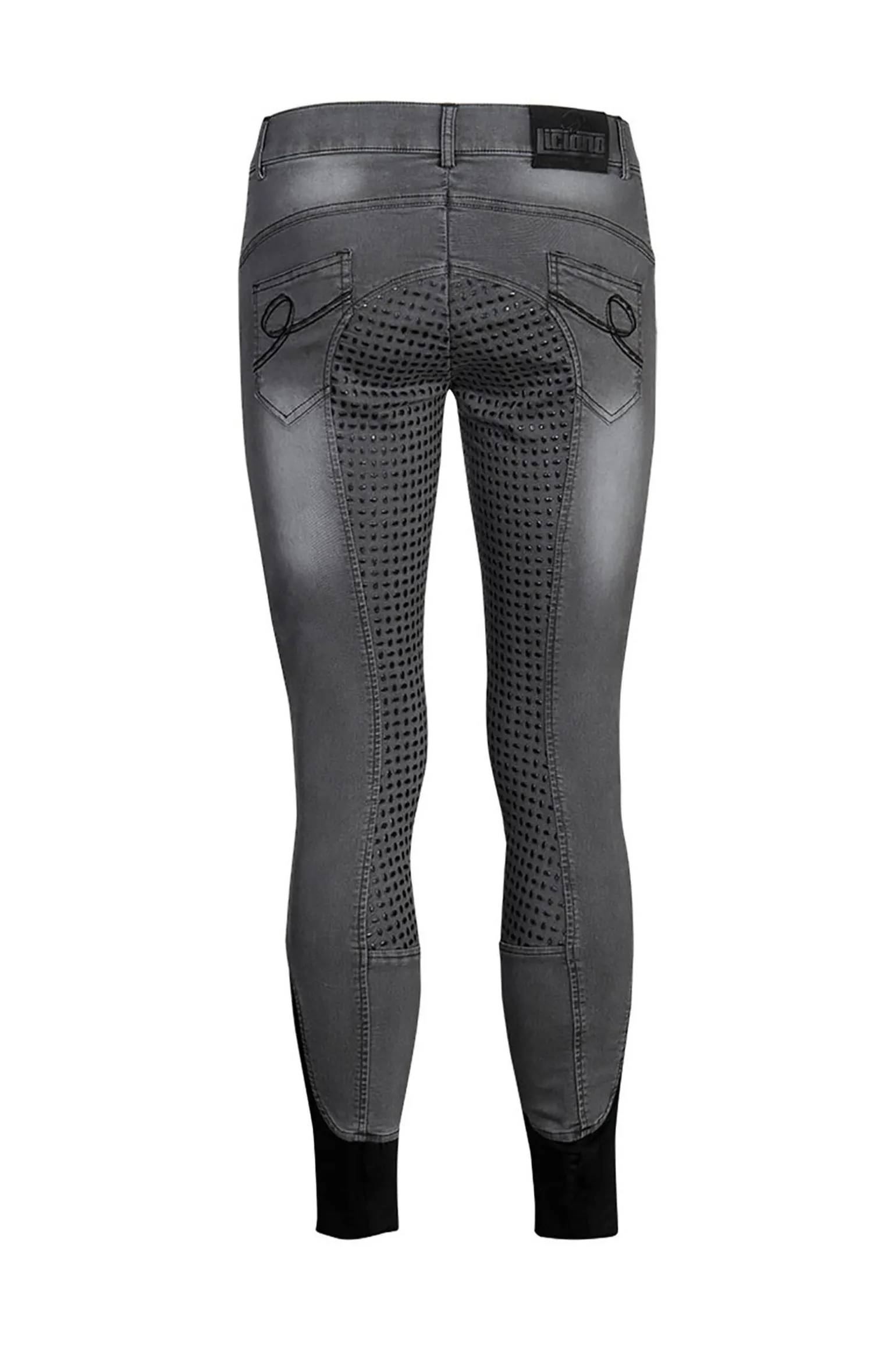 Denim-Reithose mit zwei Einschubtaschen, zwei Gesäßtaschen mit dekorativer Stickerei, mit Logo-Badge, rundgenähter Sitzfläche mit Silikon-Aufdruck, Lycra-Flex-Beinen. 97% Baumwolle / 3% Lycra.