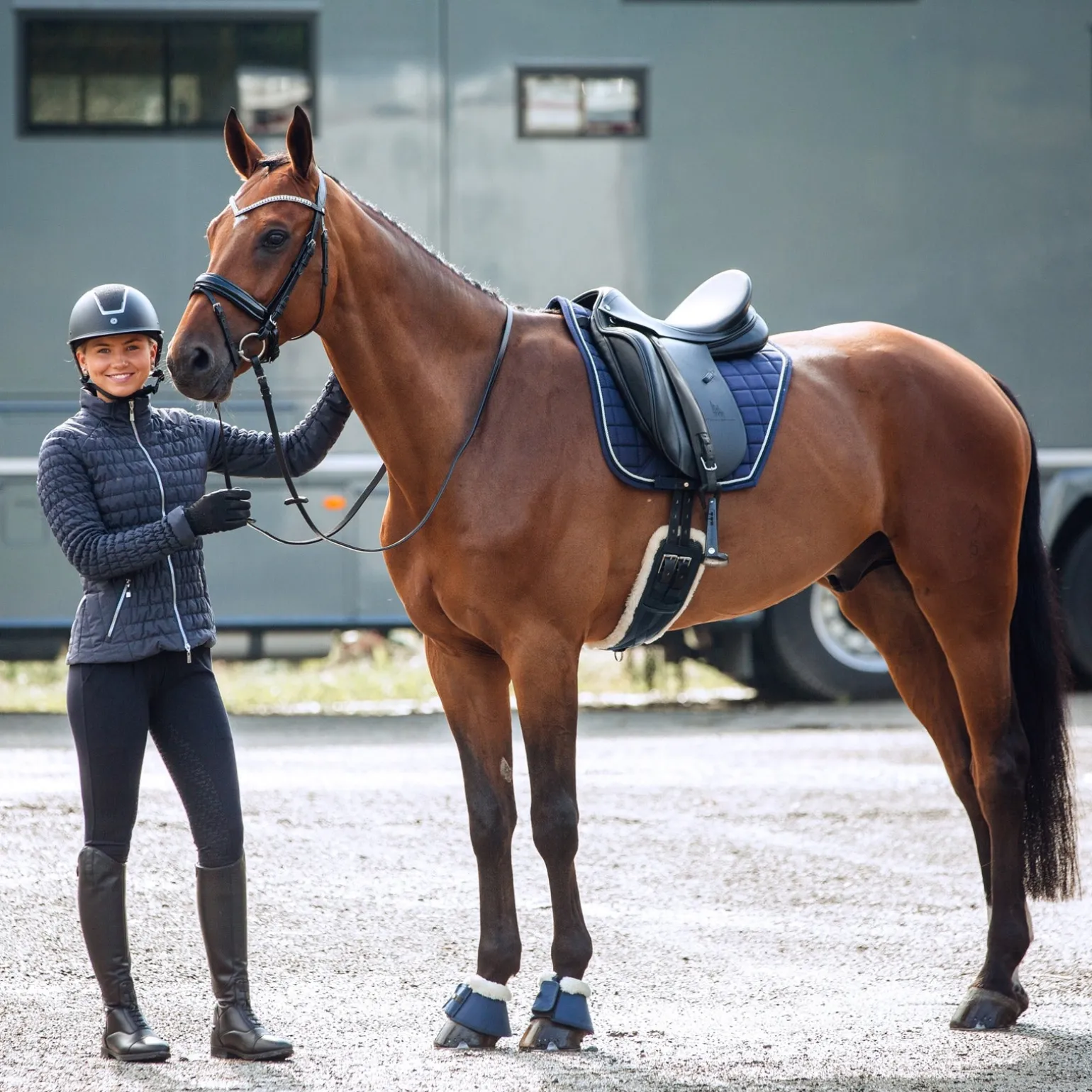 Die Horze Lincoln Dressurschabracke ist auf einzigartige Weise geschnitten, um deinen Sattel perfekt zu unterstützen. Die quadratische Steppung ist zeitlos, und die doppelte Kordel-Einfassung verleiht ihr einen hochwertigen Look. Klettverschlussriemen halten die Schabracke an ihrem Platz. Eine kleine Horze-Logo-Plakette an der Unterseite vervollständigt den Look.