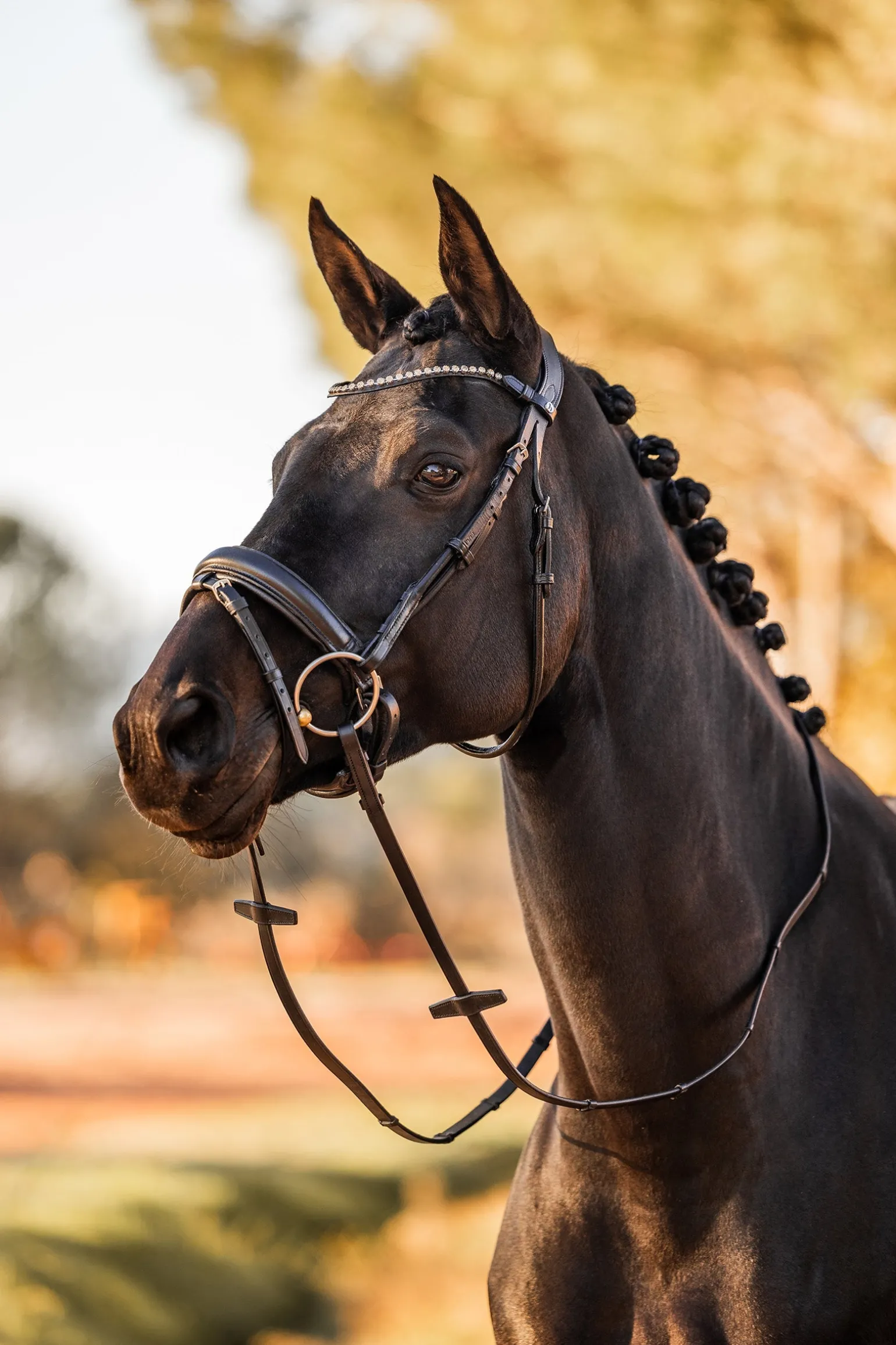 Die Horze Lockhart Trense ist anatomisch geformt, damit der empfindliche Kopf deines Pferdes keine unangenehmen Druckstellen hat. Die verstellbaren Schnallen sorgen für den perfekten Sitz. Der abnehmbare Stirnriemen ist leicht zu wechseln. Das weiche Leder ist sehr langlebig und bietet größten Komfort.
