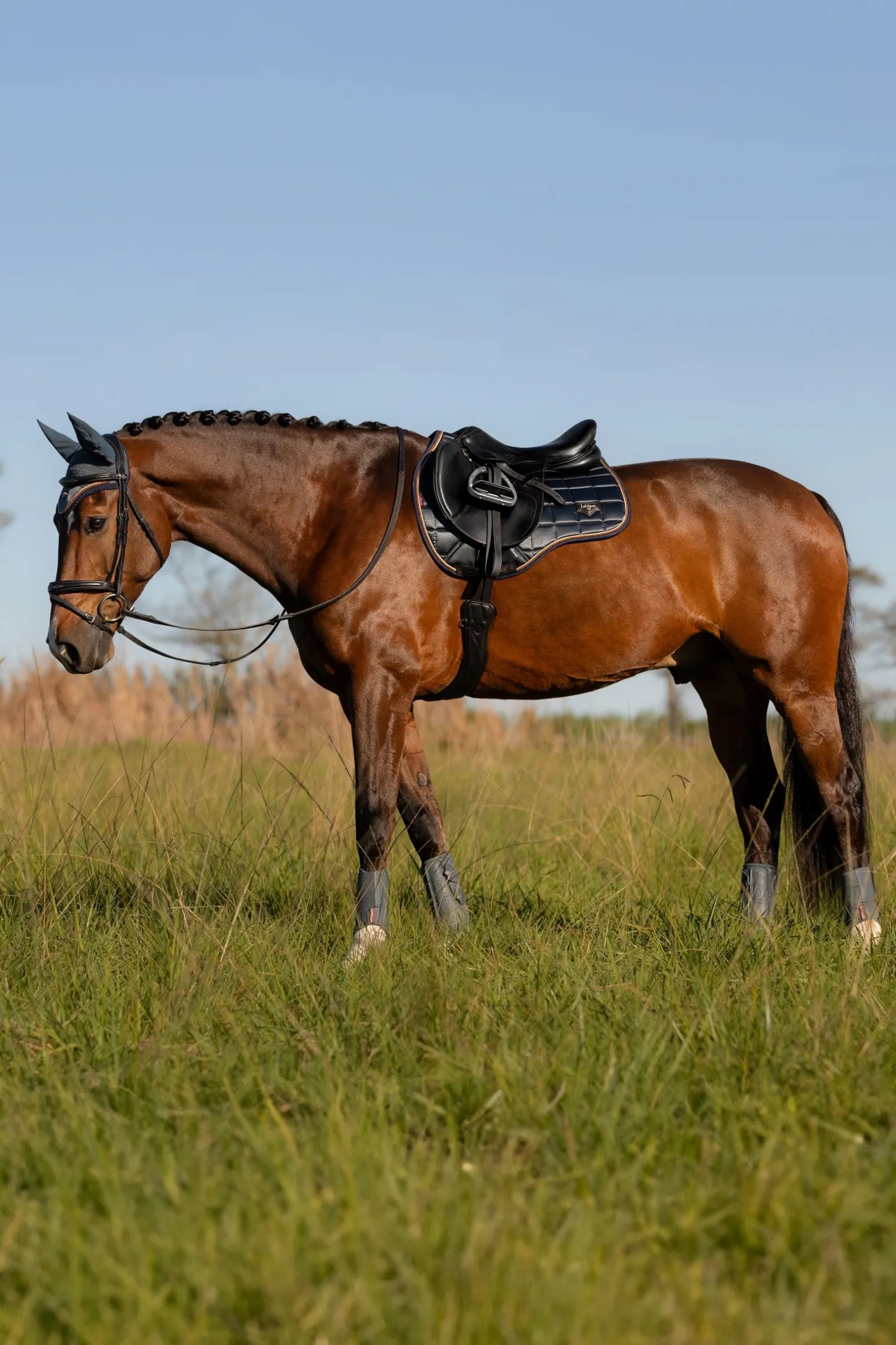 Als eines der stilvollsten Sattelpads von LeMieux verbindet die Loire Collection Eleganz und Raffinesse mit technischer Weiterentwicklung. Der gewebte Satin-Stoff der Loire Collection ist mit einer Bambusmischung gefüttert, die besonders weich und atmungsaktiv ist. Das Bambusmaterial ist temperaturausgleichend und feuchtigkeitsableitend, sodass dein Pferd unter dem Sattel kühl bleibt. Die hohe Widerristform reduziert den Druck und verbessert die Passform des Sattels. Die elastischen Sattelgurte werden an der D-Ring-Befestigung schmaler, sodass Platz für zusätzliches Zubehör bleibt.