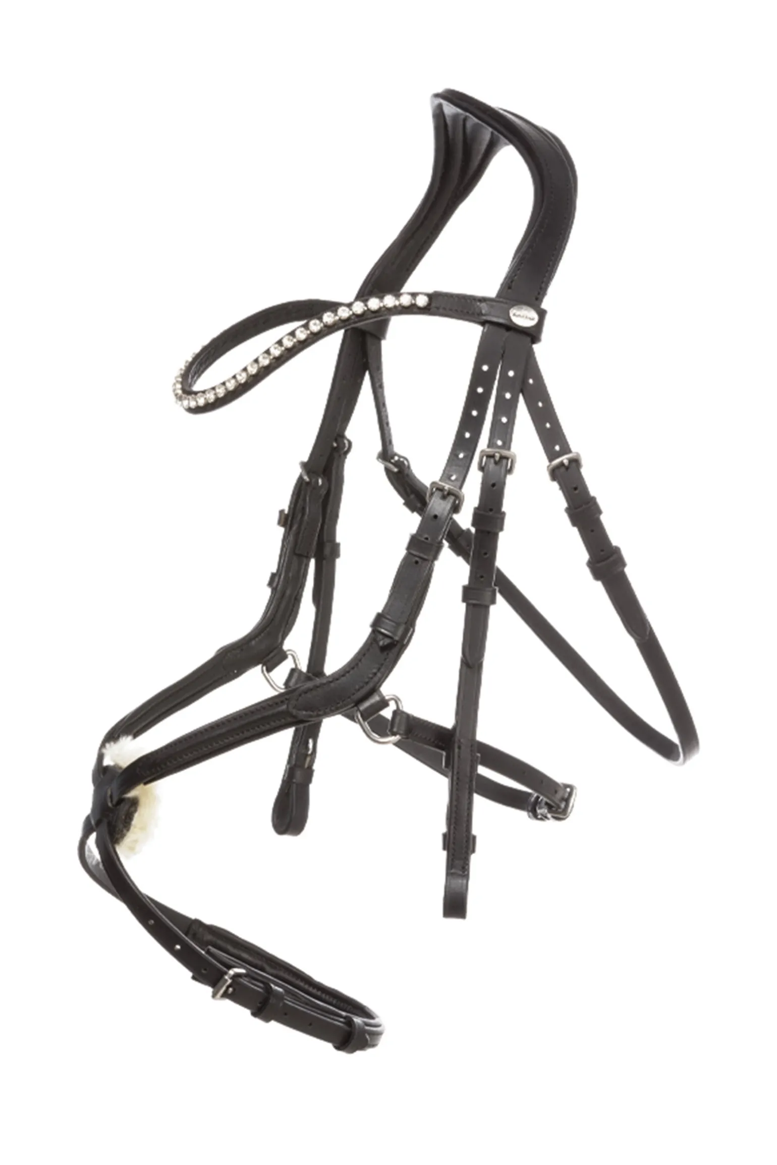 Die mexikanische Trense „Lucia“ besteht aus tollem Leder und schmiegt sich angenehm an den Pferdekopf an. Der Nasenriemen ist bombiert und seitlich geschwungen, ähnlich dem Kavalkade Modell „Ivy“. Das Genickstück ist auf beiden Seiten verstellbar, deutlich anatomisch ausgeschnitten und weich gepolstert. Das Nasenpolster ist austauschbar und besteht jeweils aus einem echten medizinischen Lammfell und aus einem Lederpolster. Der Kehlriemen ist angeschrägt, das Stirnband gebogen, schmall und besitzt weiße Strasssteine. Ein besonderer Hingucker sind die Lackeinsätze am Nasenriemen bei dem Trensenmodell schwarz-lack. Zu dem Trensenzaum sind schmale gummierte Zügel mit Stegen inklusive.