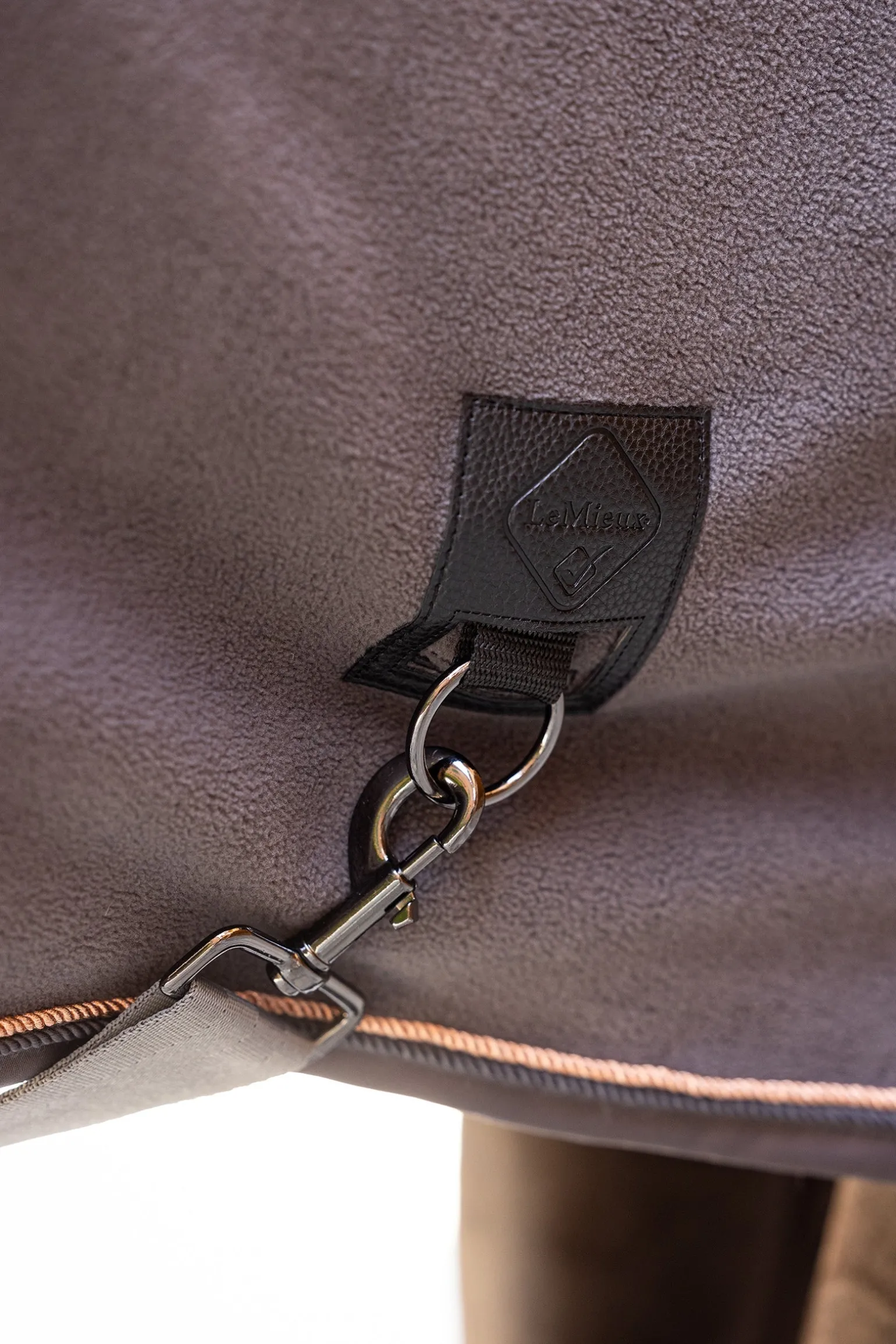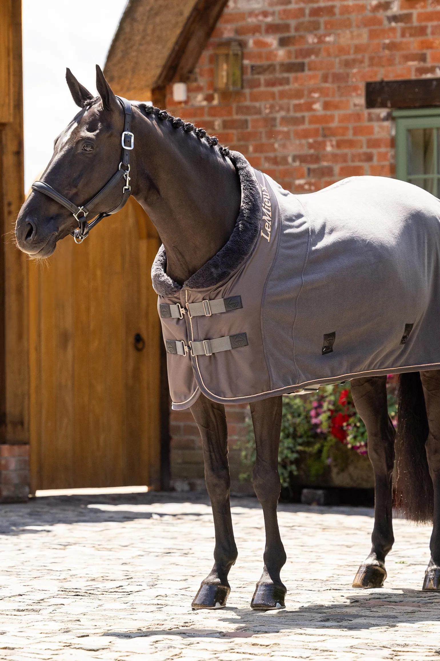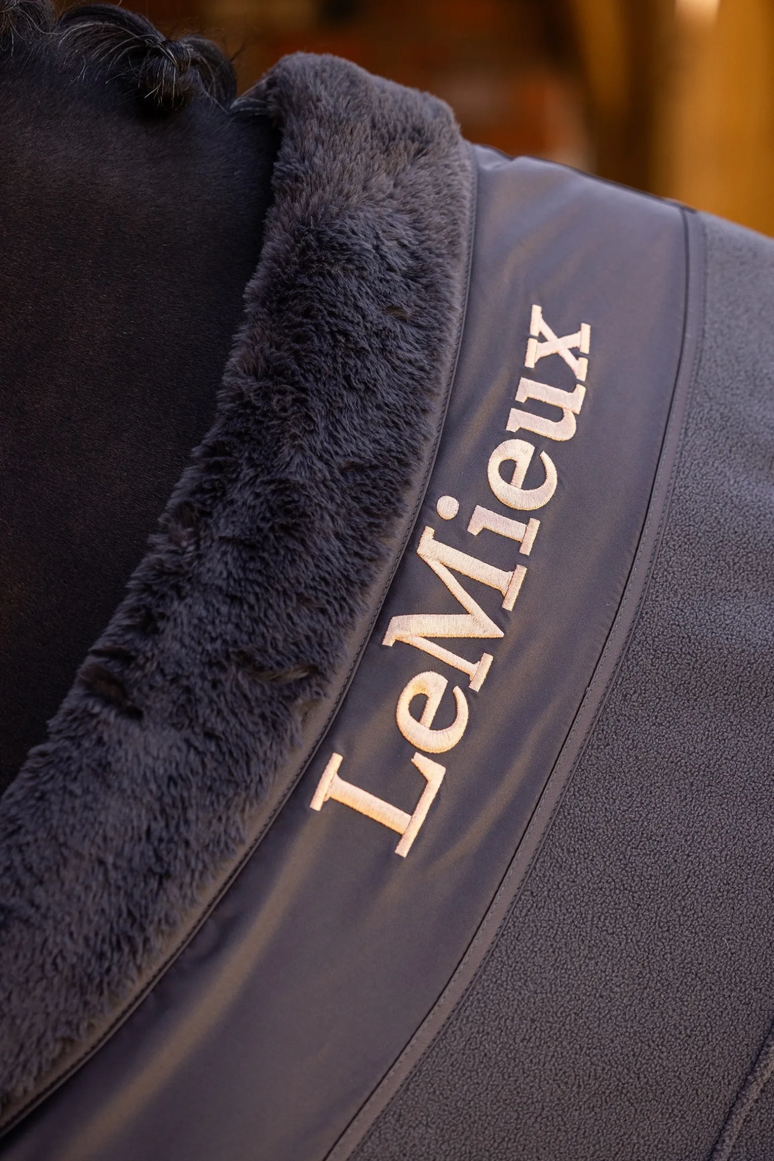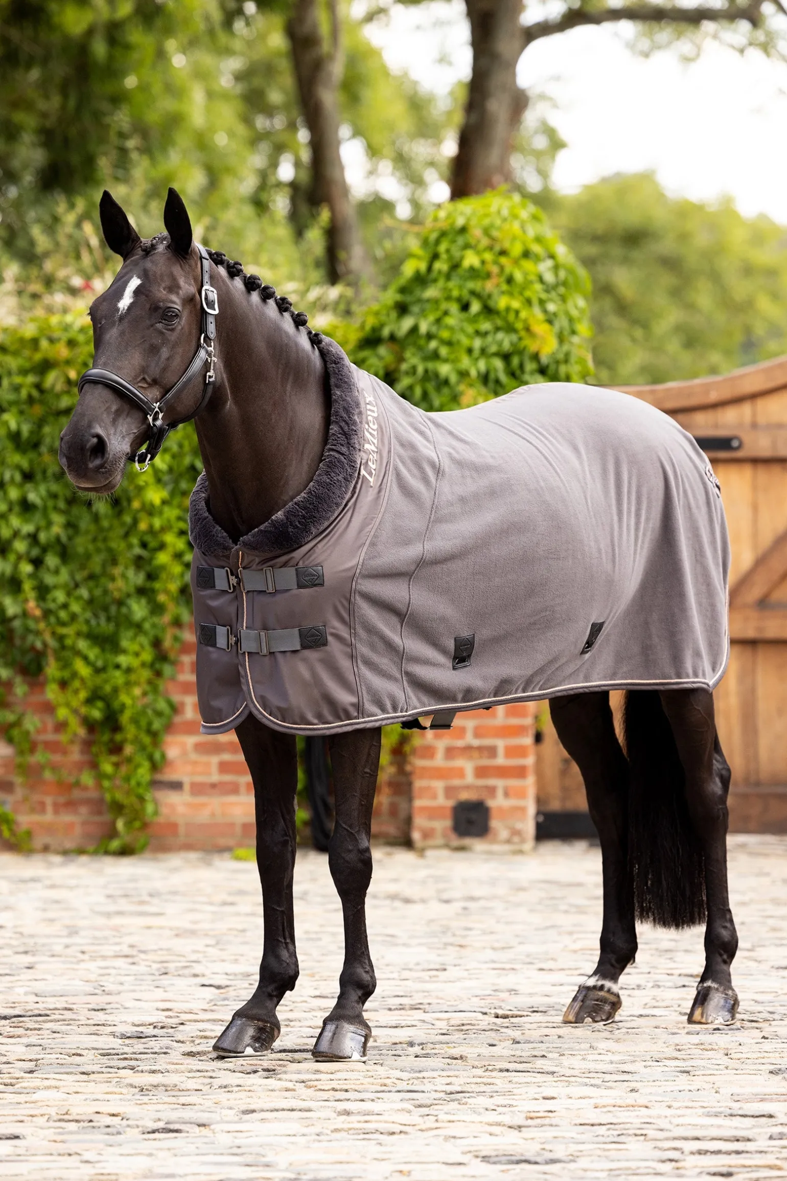 Eine smarte und unglaublich vielseitige Decke, die es in sich hat. Die LeMieux Fleecedecke ist aus einem superweichen Anti-Pilling-Polarfleece gefertigt, das für eine optimale Feuchtigkeitsaufnahme und Trocknung sorgt. Die perfekte Decke zum Überwerfen auf Turnieren. Die Decke wird durch zwei Bauchgurte gesichert, die innen oder außen an der Decke befestigt werden können. Die Decke ist luxuriös mit einem Kragen aus Fake-Kaninchenfell ausgestattet und mit farblich abgestimmten Borten und Schmuckelementen an der Hüfte gestylt.
