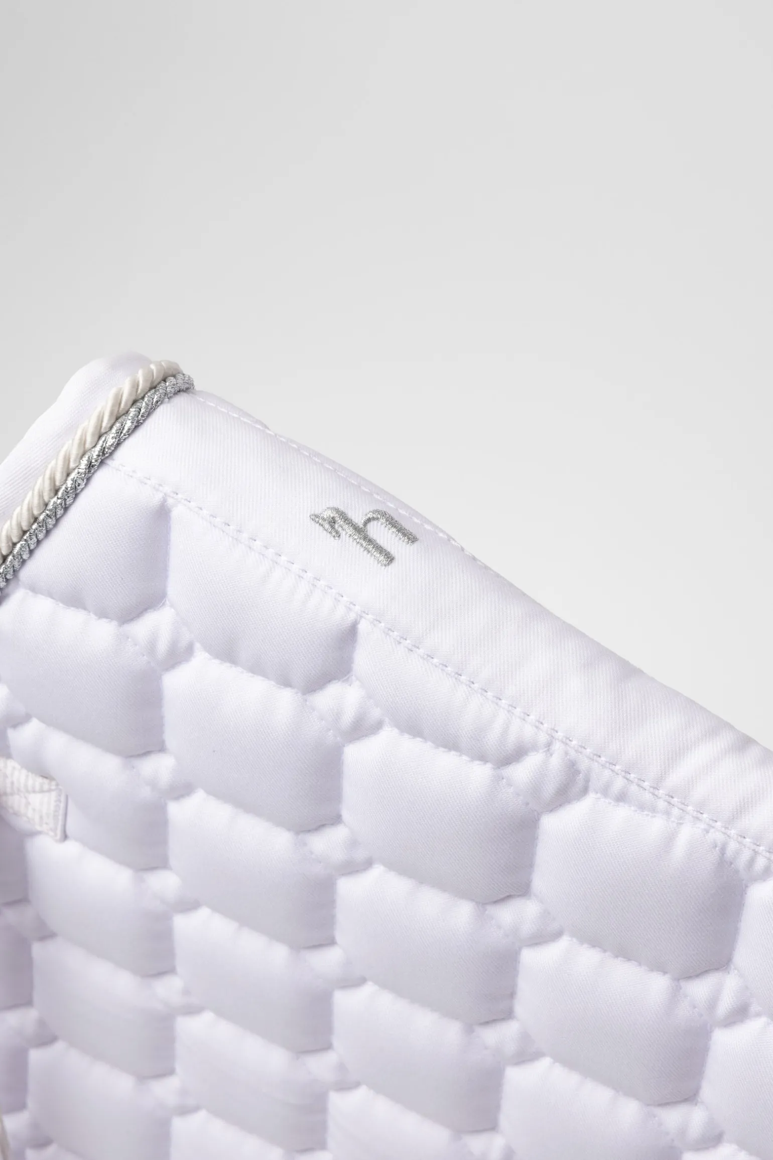 Diese elegante Dressurschabracke wurde speziell für Turniere entwickelt. Die anatomische Rückenlinie sorgt für eine optimale Passform und hohen Tragekomfort für das Pferd. Befestigungsriemen mit Haken- und Flauschverschluss gewährleisten sicheren Halt. Ein Lederpatch mit Aussparung ermöglicht die einfache Platzierung der Startnummer. Die Stickerei am Widerrist verleiht eine edle Optik. Weiche Polsterung bietet zusätzlichen Schutz, während das Silikon-Badge auf der linken Seite einen modernen Akzent setzt.
