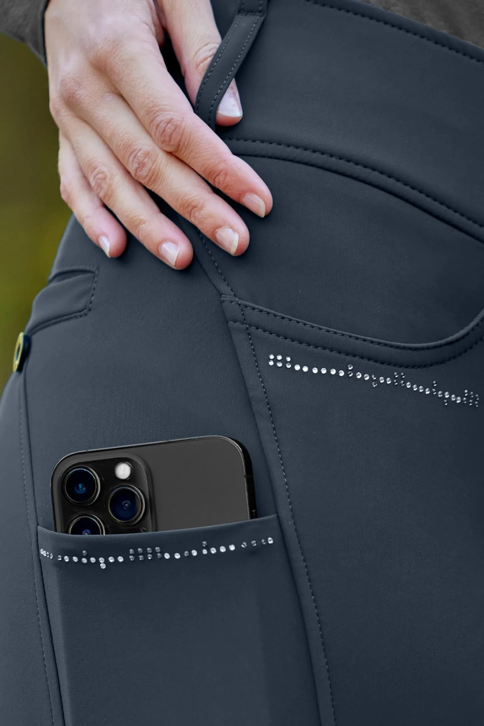 Diese Reitleggings verfügen über einen silikonisierten Vollbesatz mit verschiedenen Grip-Zonen für mehr Stabilität. Der integrierte Silikon-Logo-Druck, elastische Knöchelbündchen und das verbundene Material sorgen für hervorragende Elastizität, Formbeständigkeit und Atmungsaktivität, während sie gleichzeitig ein weiches Innenfutter bieten. Mit bi-elastischem Stoff für eine figurschmeichelnde Passform und einen Kompressionseffekt gewährleisten diese Leggings Komfort und Leistung. Dekorative Paspeltaschen mit Knöpfen auf der Rückseite, Vordertaschen und eine Handytasche mit Strassdetails verleihen dem Design einen stylischen Akzent. Abgeschlossen mit einem hochwertigen E·L·T Metall-Tag.