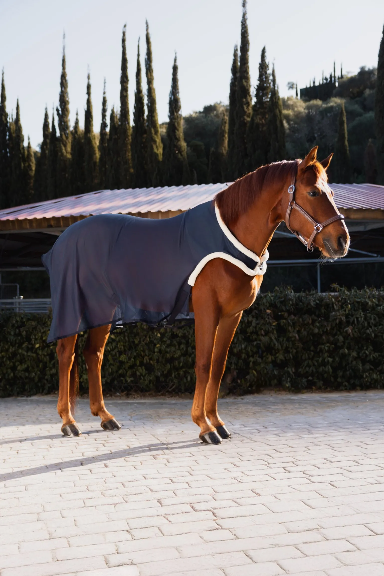 Diese Führanlagendecke wurde speziell entwickelt, um deinem Pferd während des Trainings in der Führanlage optimalen Komfort zu bieten. Der großzügige Schulterbereich ist ausgeschnitten, um maximale Bewegungsfreiheit und eine uneingeschränkte Schrittlänge zu ermöglichen. Die Decke wird mit einem einzelnen Bauchgurt vorne sicher verschlossen und verfügt über überkreuzte Gurte sowie einen Schweifriemen für optimalen Halt. Der Hals- und Schulterbereich ist mit weichem Kunstfell gefüttert, um Scheuerstellen zu vermeiden. Eine funktionale und atmungsaktive Wahl für das tägliche Training.