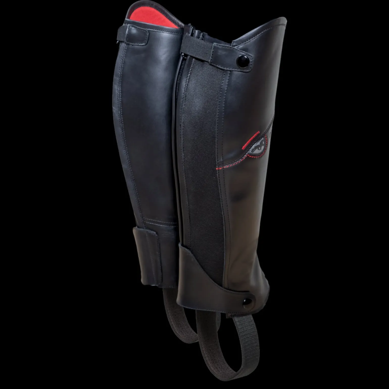 Mini-Chaps mit toller Passform durch hochwertiges Leder und zusätzliche Gummizone. Der elastische Fußriemen sorgt dafür, dass er korrekt am Stiefel befestigt bleibt und angenehm zu tragen ist. Reißverschluss und Druckknöpfe schließen auf der Rückseite.