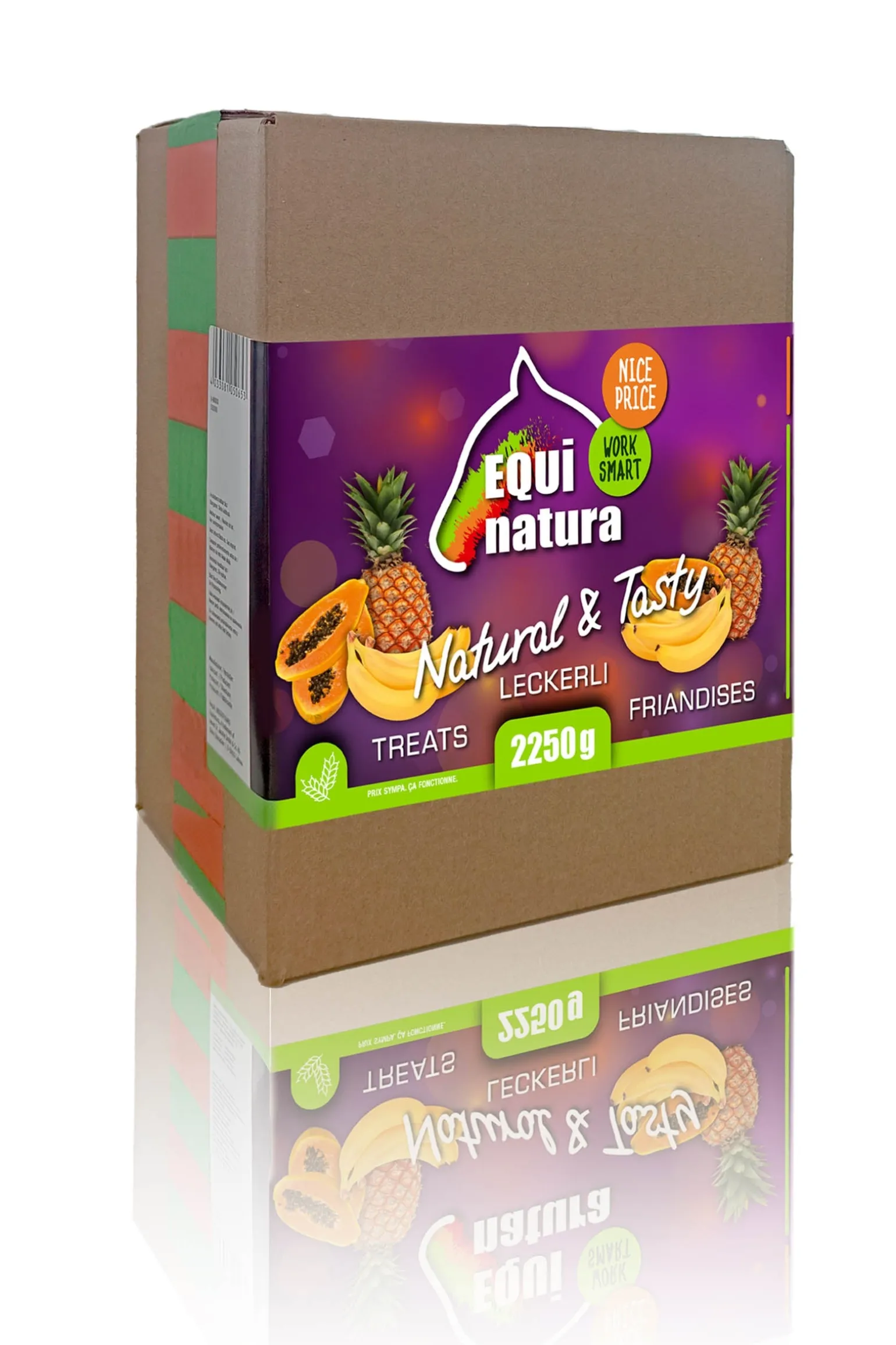 Ananas – Papaya – Banane: Equinaturas Naturkost Leckerlis sind mit echten getrockneten Fruchtstücken von Ananas, Papaya und Banane ein echter Genuss für große und kleine Pferde. Das Produkt ist ADMR-konform – bitte prüfe vor der Teilnahme an jeglichen Veranstaltungen außerhalb Deutschlands die jeweiligen lokalen Regeln.