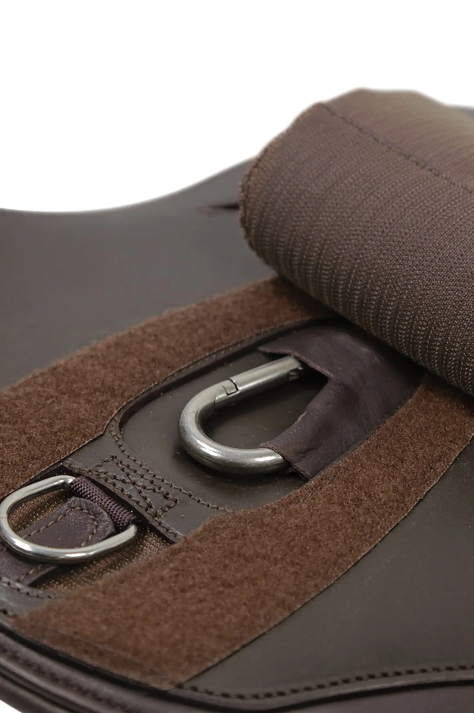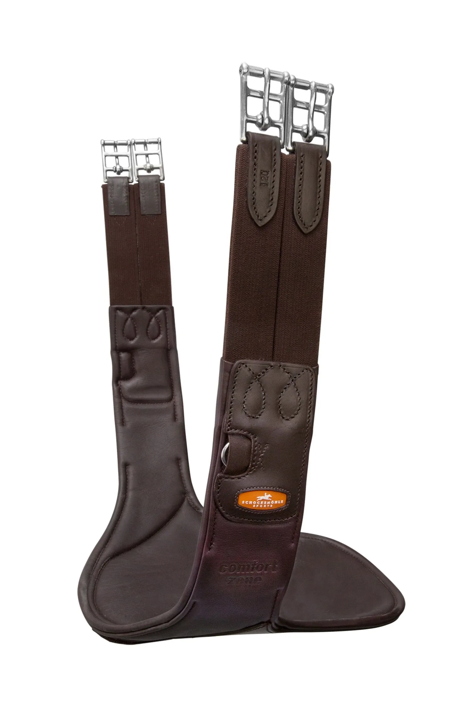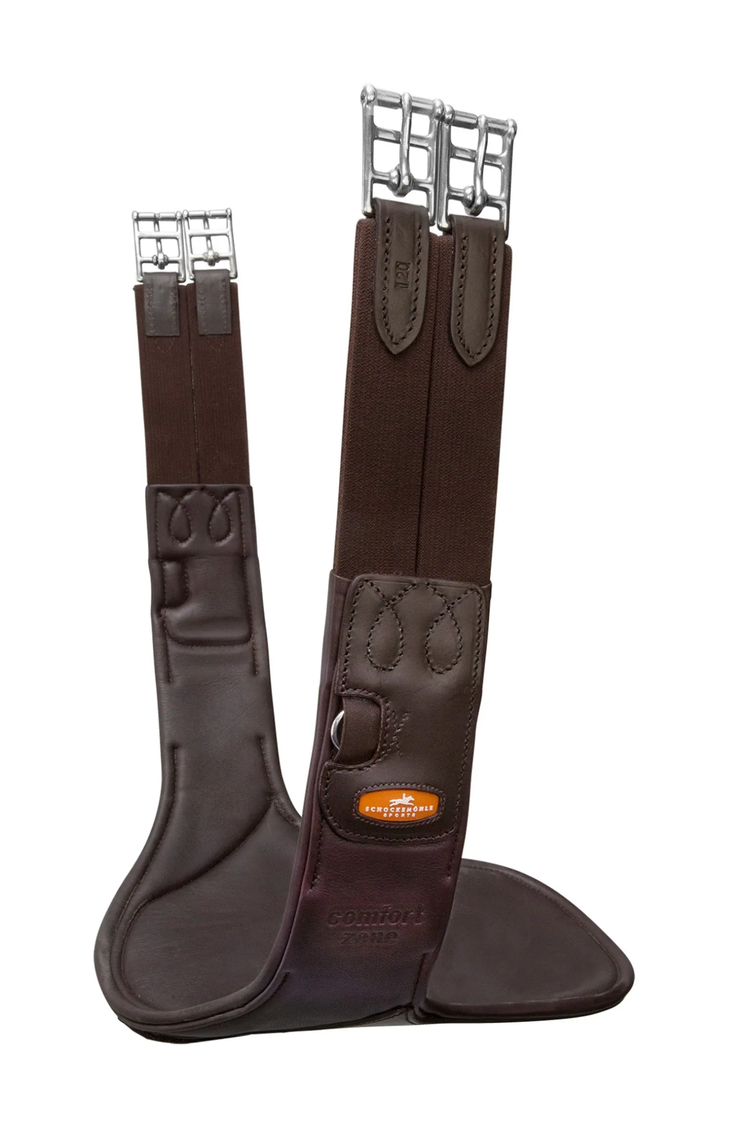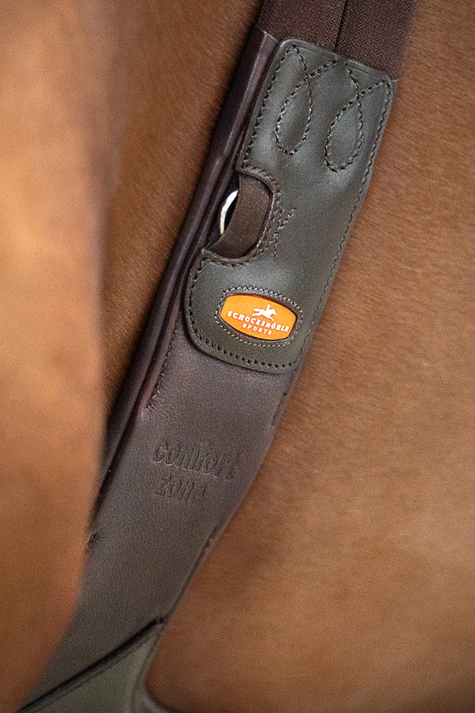 Mehr Bewegungsfreiheit dank optimaler Druckverteilung: Die innovative „Comfort Zone“ bei dem Stollenschutzgurt Oklahoma von Schockemöhle Sports setzt dafür neue Maßstäbe. Anatomisch geformt, ist der Sattelgurt im Bereich der Ellenbogen besonders flach gearbeitet. Gleichzeitig sorgt im Bereich des Brustkorbs die breitere Mittelplatte mit mehrlagigem Weichschaum für eine noch bessere Druckverteilung. Sie besteht aus festerem Leder und schützt damit auch vor Schlägen. Der große Karabiner erleichtert dem Reiter das Einschnallen des Vorderzeugs. Einmal befestigt, verhindert die Abdeckung mit der großen Lederklappe das gefährliche Hereintreten des Pferdes in beispielsweise ein Vorderzeug. Das beidseitige dreilagige Elastik sowie die weich gepolsterten Rollenschnallen heben den Komfort für das Pferd zusätzlich auf ein neues Level.