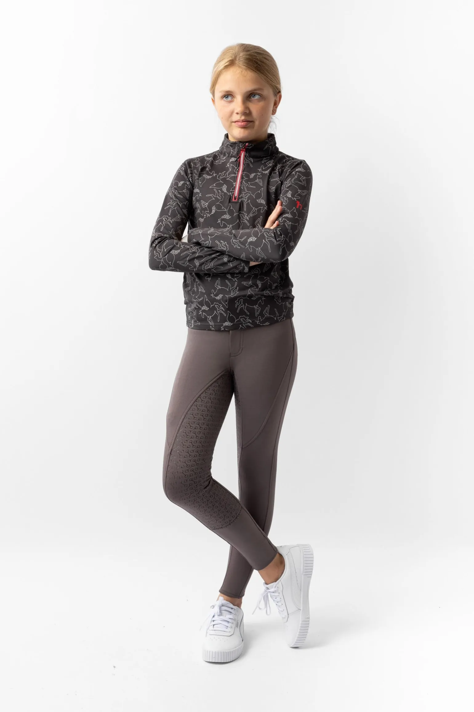 The Horze Pegasus Kids’ Training Shirt is a fun and practical choice for active young riders. Made from breathable, brushed fabric, it provides warmth and comfort while remaining lightweight. The quarter-zip neck allows for easy ventilation, and the stretch fabric ensures freedom of movement. A bold Pegasus print adds a touch of fun to every ride. Easy to care for and durable, this shirt is perfect for training or casual wear.