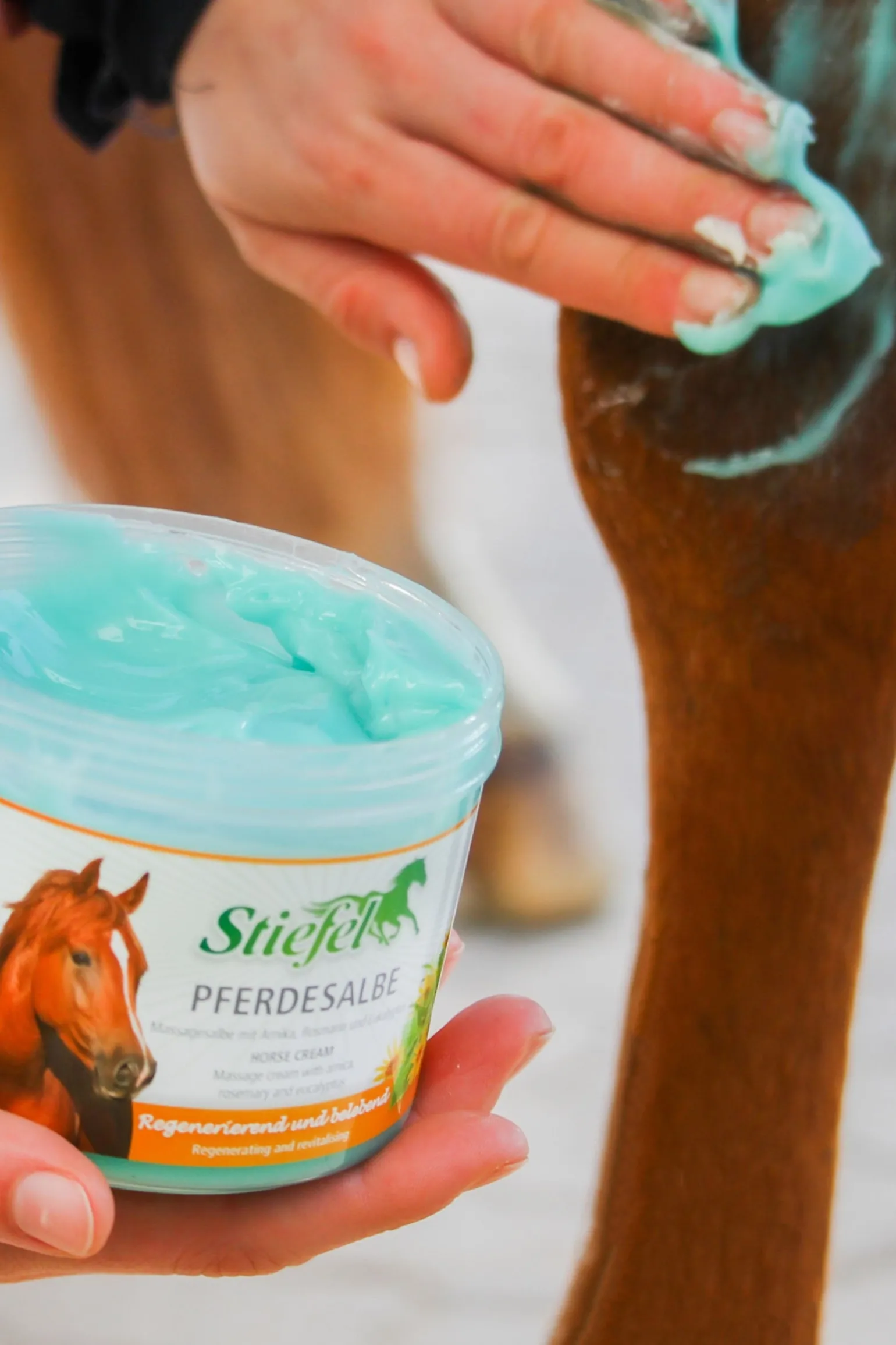 Stiefel Pferdesalbe ist eine Massagesalbe mit Arnika, Menthol, Rosmarin und Eukalyptus, die nach anstrengendem Training oder Wettkampf wohltuend auf beanspruchte Sehnen und Gelenke wirken kann. Die natürlichen Inhaltsstoffe kühlen, beleben und erfrischen und sind auch für den Einsatz im Schulter- und Rückenbereich geeignet. Rosmarin und Arnika wird zudem eine lindernde Wirkung bei Schmerzen nachgesagt. Äußerlich angewendet ist Arnika nicht doping-relevant. Für einen optimalen Effekt sollte Stiefel Pferdesalbe leicht einmassiert werden, bevor eine dickere Schicht aufgetragen wird, die unbedeckt einziehen sollte. Anwendung: Stiefel Pferdesalbe leicht einmassieren, danach eine dickere Schicht auftragen und unbedeckt einwirken lassen.