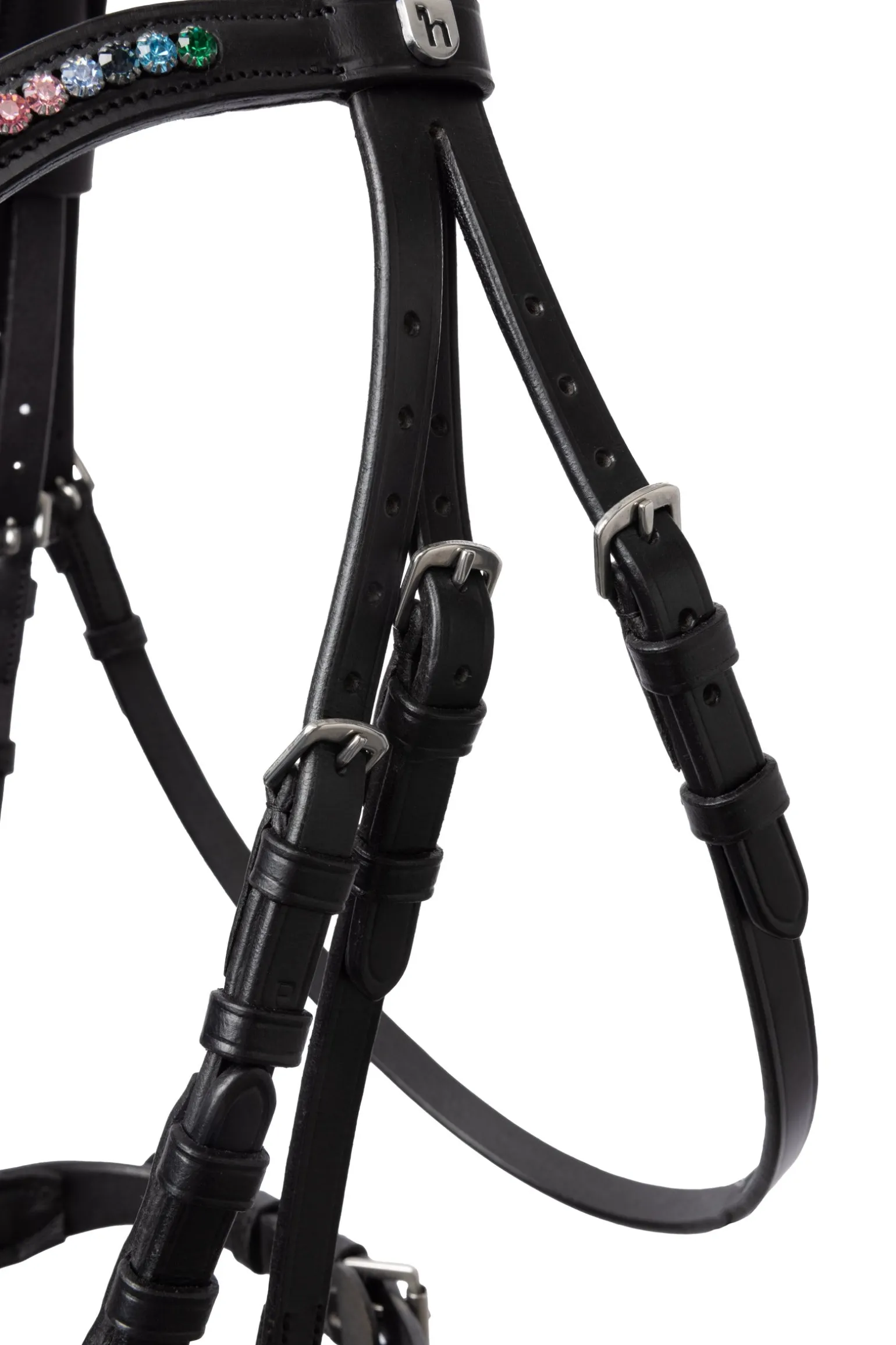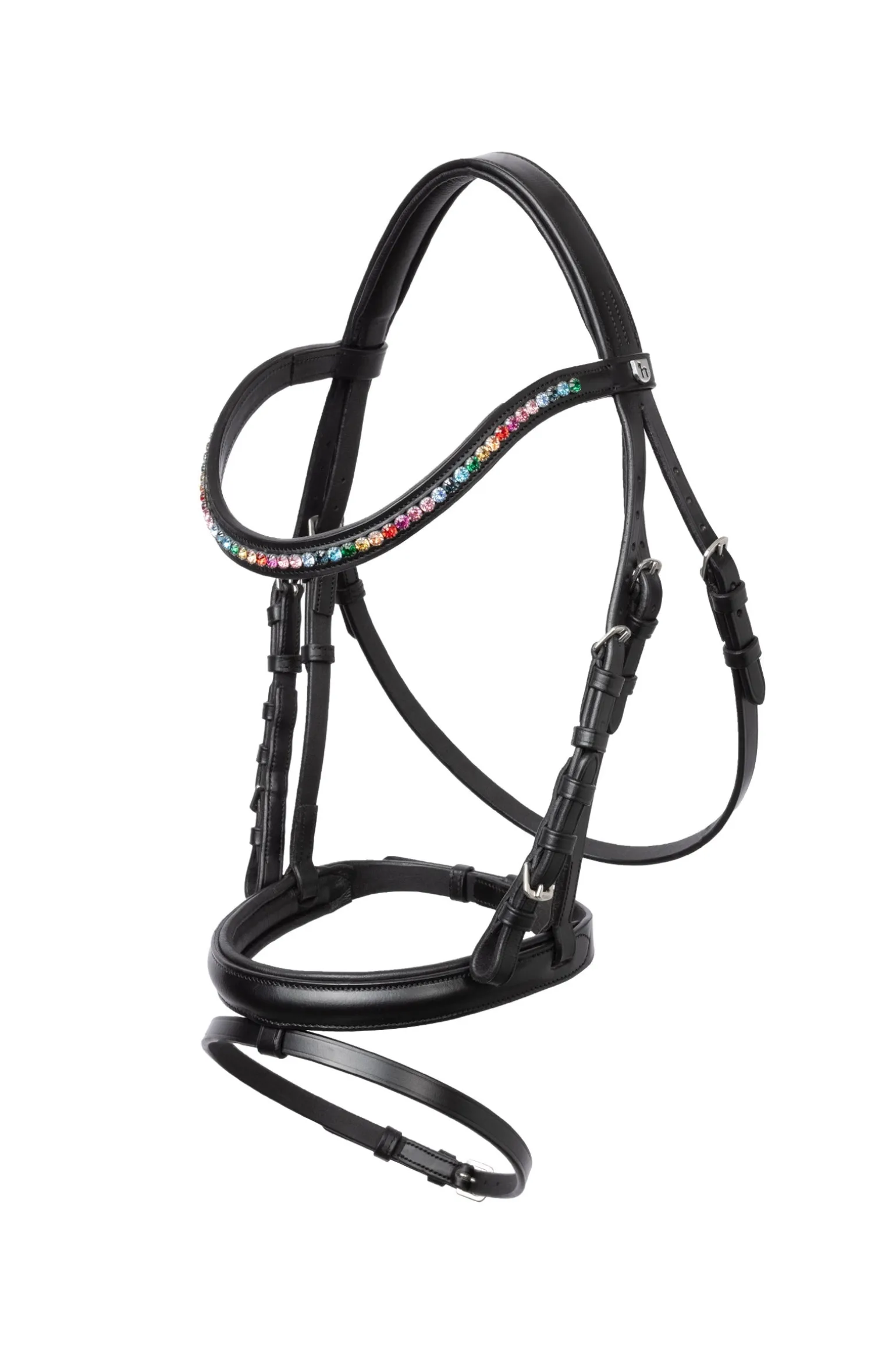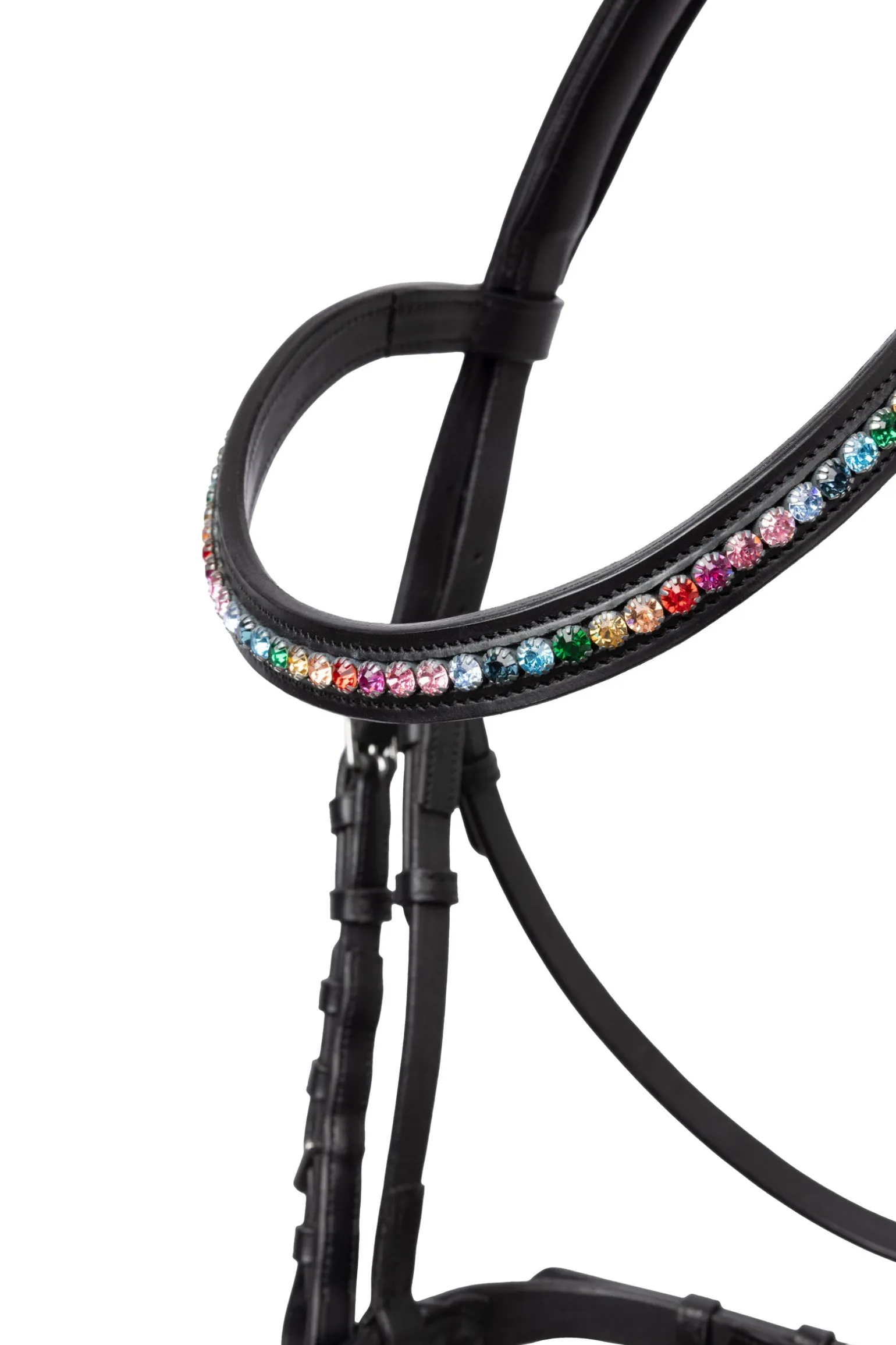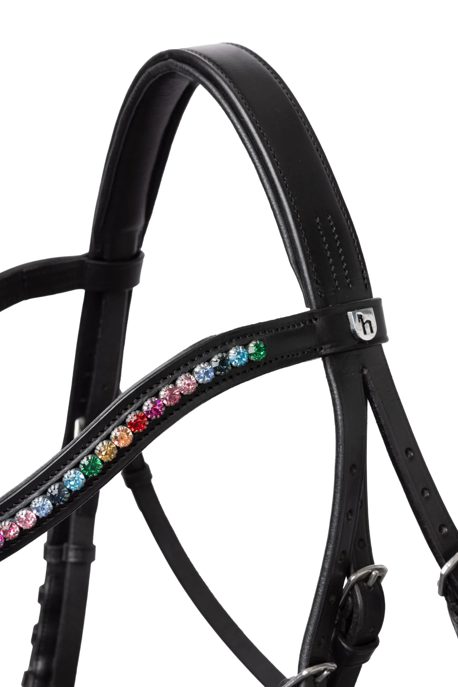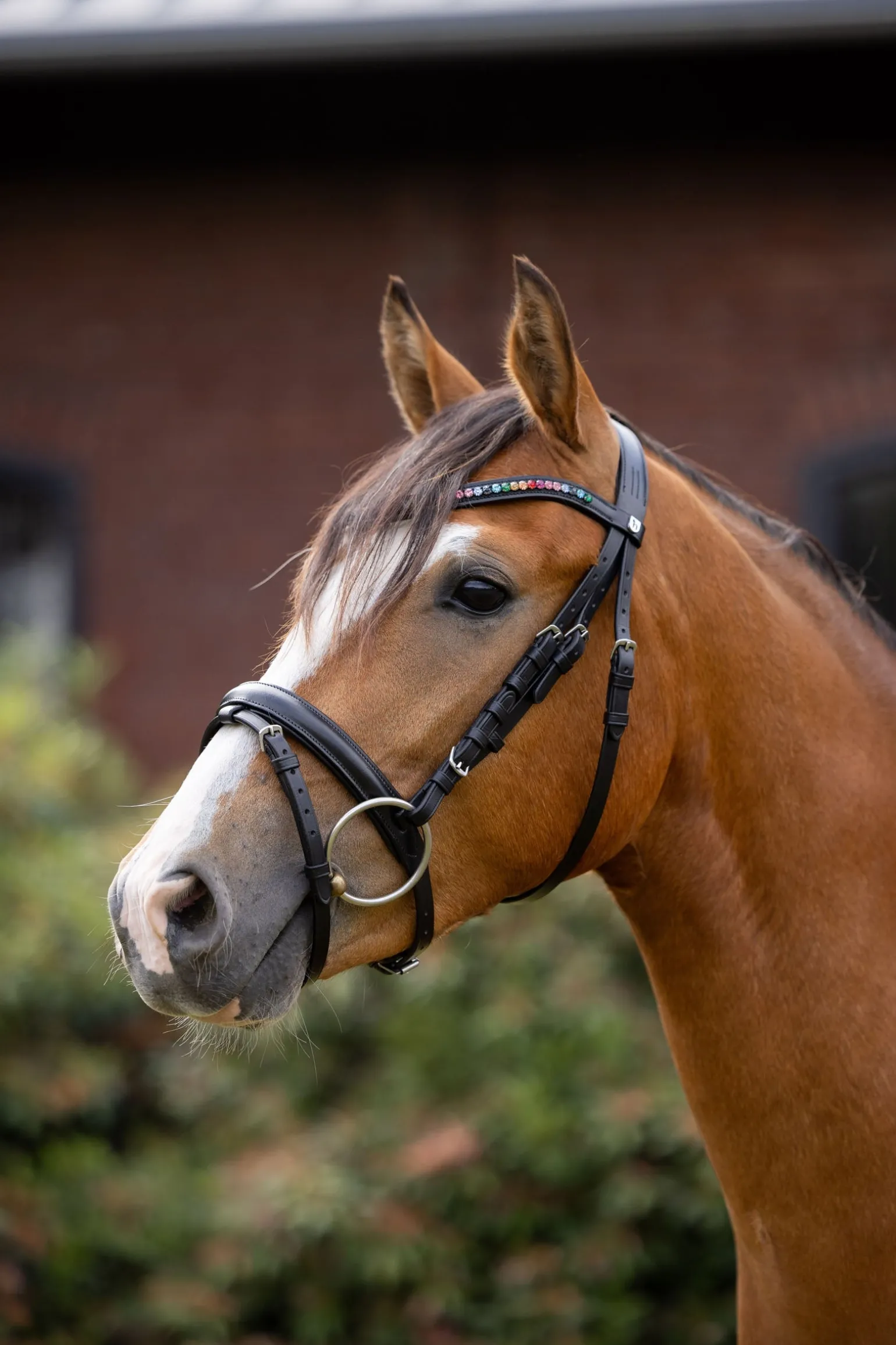 Entdecke das klassische Modell, das Stil und Komfort perfekt kombiniert. Dieses zeitlose Design zeichnet sich durch ein auffälliges, buntes Regenbogen-Stirnband aus, das deinem Pferd einen einzigartigen Look verleiht. Das Stirnband ist weich gepolstert, um optimalen Komfort zu gewährleisten und unangenehme Druckstellen zu vermeiden. Hochwertige Metallbeschläge sorgen für Langlebigkeit und fügen sich nahtlos in das elegante Gesamtbild ein.