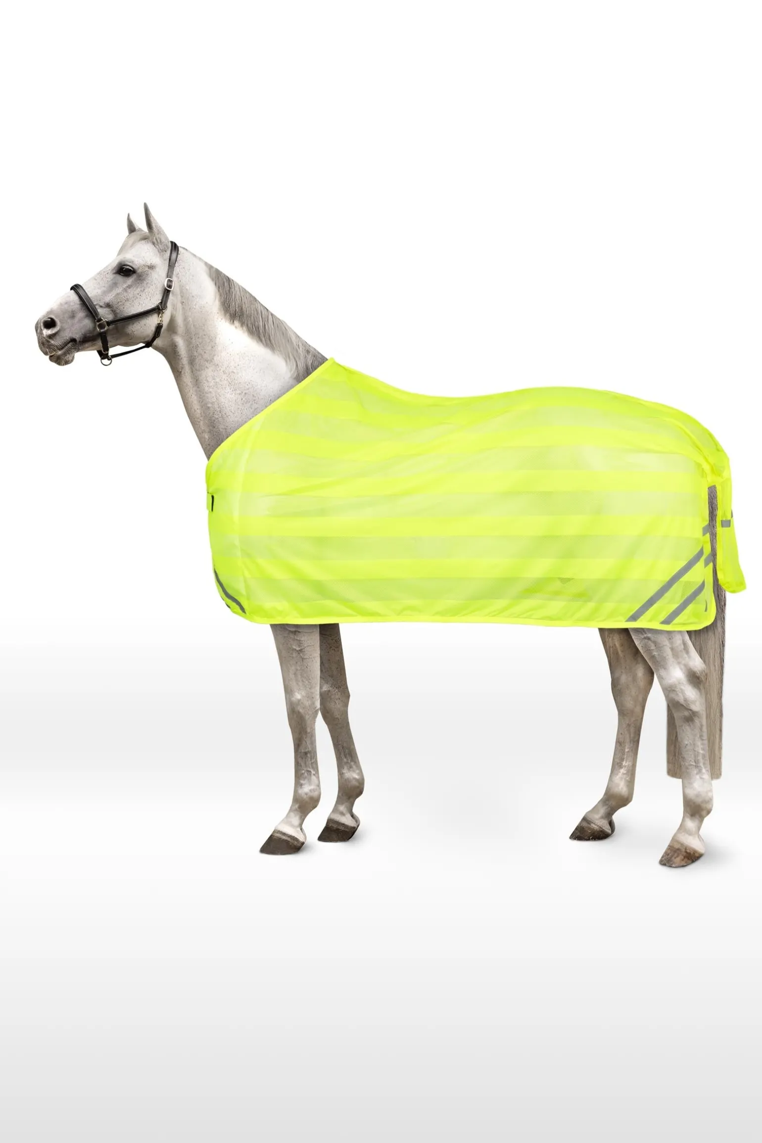 Diese Decke ist aus Netzmaterial hergestellt und vorne und hinten mit reflektierendem Band versehen, um sicherzustellen, dass dein Pferd im Dunkeln und im Straßenverkehr gesehen wird. Ein Klettverschluss mit T-Schnalle hält sie an ihrem Platz und verhindert Verrutschen. So bleibt dein Pferd sicher und sichtbar.