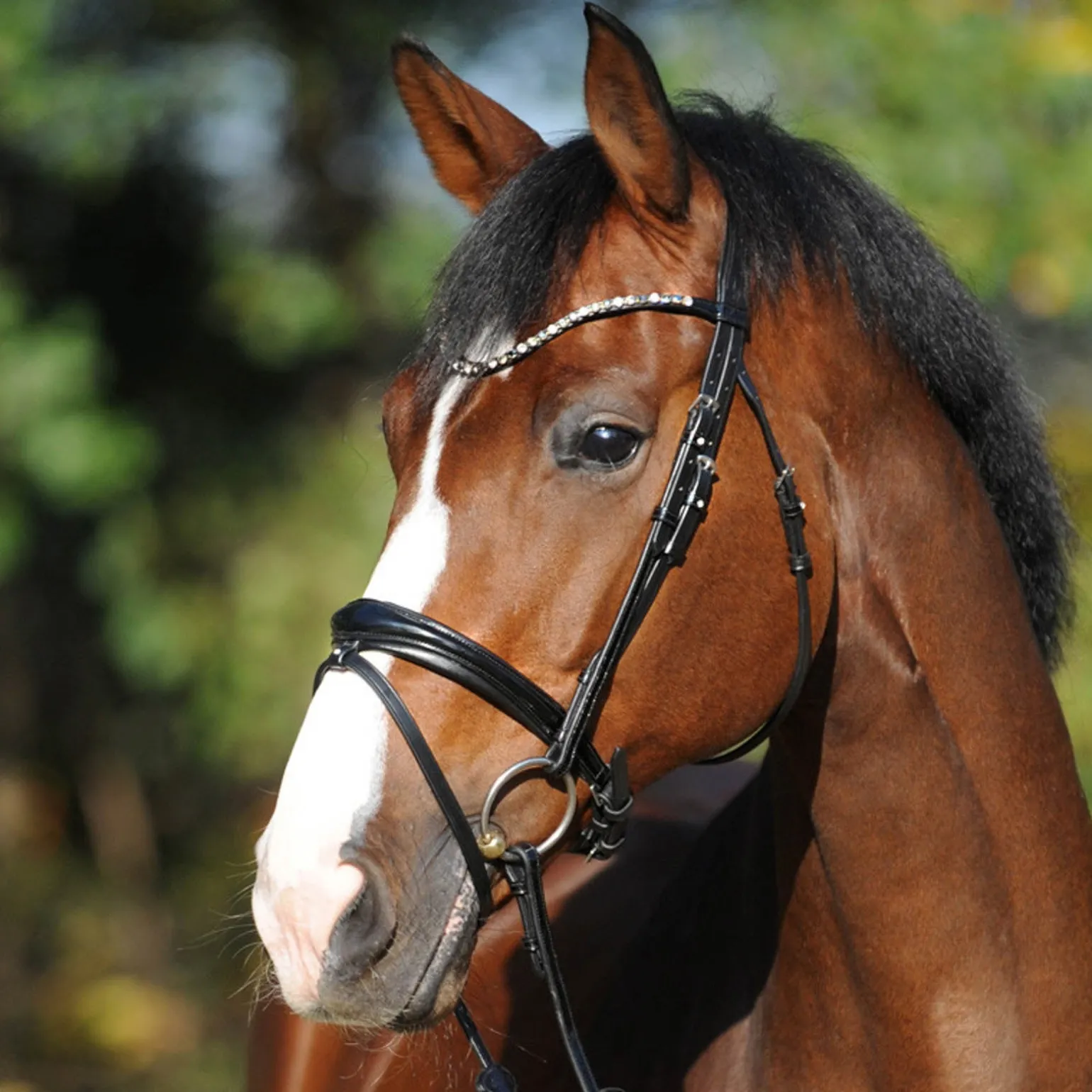 Trense Reyna KavalSH4 mit abnehmbarem Sperriemen ohne sichtbare Halterung.