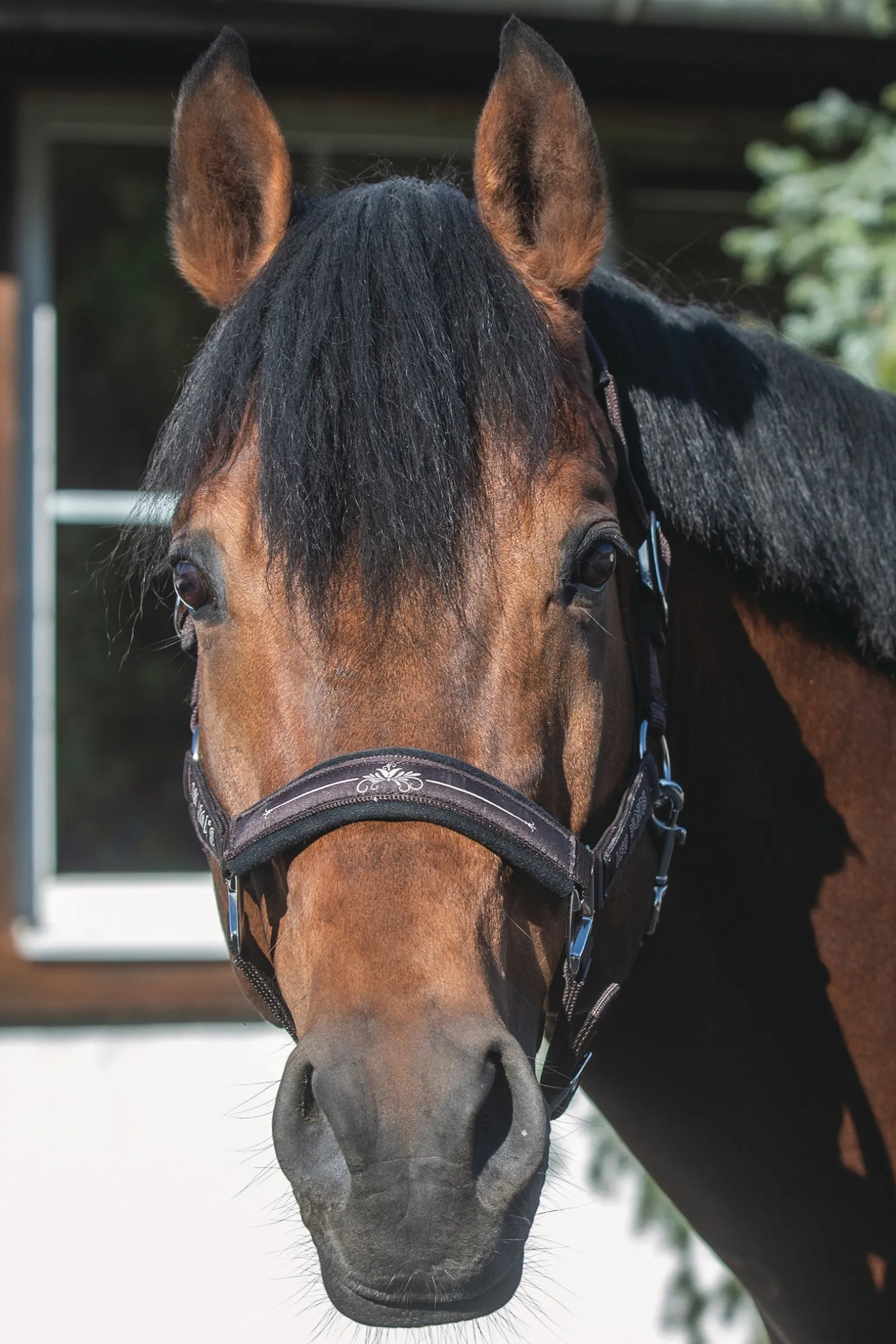 Halfter „Rosi“ , silberfarbene Beschläge, Genickstück und Nasenriemen soft unterlegt, USG SPORTS Logo und Rosenverzierung auf dem Nasenband.