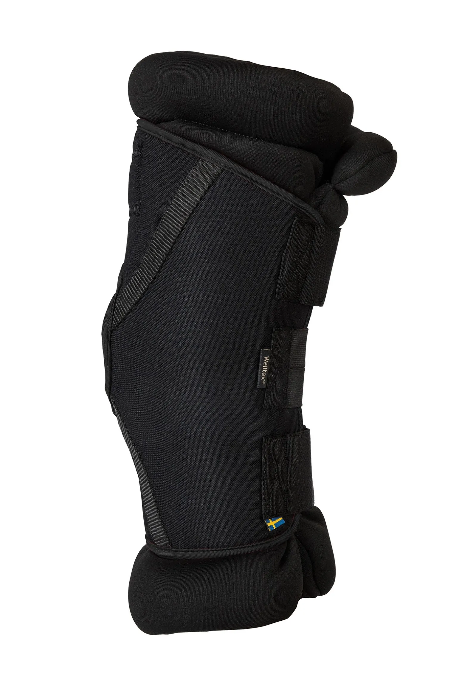 Neues und aktualisiertes Deluxe-Modell der beliebten Royal Hock Boots von Back on Track! Die Sprunggelenkschoner bestehen aus zwei Teilen: einer strapazierfähigen und robusten Außenschale und einem dicken Innenpolster mit Welltex®-Technologie. Das Royal Deluxe Modell ist anatomisch geformt, um eine optimale Passform rund um die Sprunggelenksspitze zu gewährleisten. Die Außenschale ist gut geformt und hat strategisch platzierte Nähte, um Druckstellen an den empfindlichen Sehnen des Pferdes zu vermeiden. Die Öffnung über der Spitze sorgt für gute Flexibilität und einen sicheren Sitz. Das Innenpolster geht hoch am Bein und hat eine abgerundete Form, um den bestmöglichen Komfort zu bieten. Das Polster kann beim Waschen der Schoner leicht entfernt werden, da es mit einem Klettverschluss am äußeren Teil befestigt ist. Das Innenpolster ist mit Welltex® gefüttert. Das Material reflektiert Körperwärme in Form von Ferninfrarot-Energie. Es kann die Blutzirkulation in diesem Bereich anregen und Probleme mit Steifheit, Entzündungen und Arthrose lindern. Die Schoner sind mit drei starken und haltbaren Klettverschlussriemen ausgestattet. Der mittlere Riemen hat ein zweiteiliges Gummiband, um Druck auf das Gelenk zu vermeiden. Die Sprunggelenkschoner sind für den Einsatz während der Ruhephase im Stall oder beim Transport geeignet.