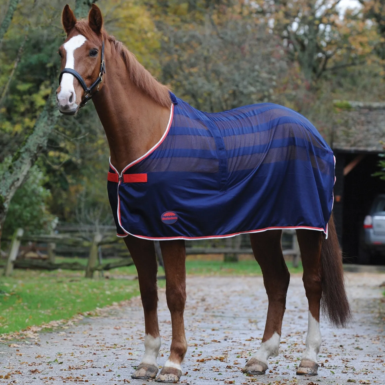 Leichte Abschwitzdecke mit Mesh Einlagen, die atmungsaktiv sind und schnell Feuchtigkeit abtransportieren. Zusätzliche Eigenschaften wie Frontverschluss, versteckte Bauchgurte, Widerristpolsterung aus Fleece und Schweifkordel. Standard Hals.
