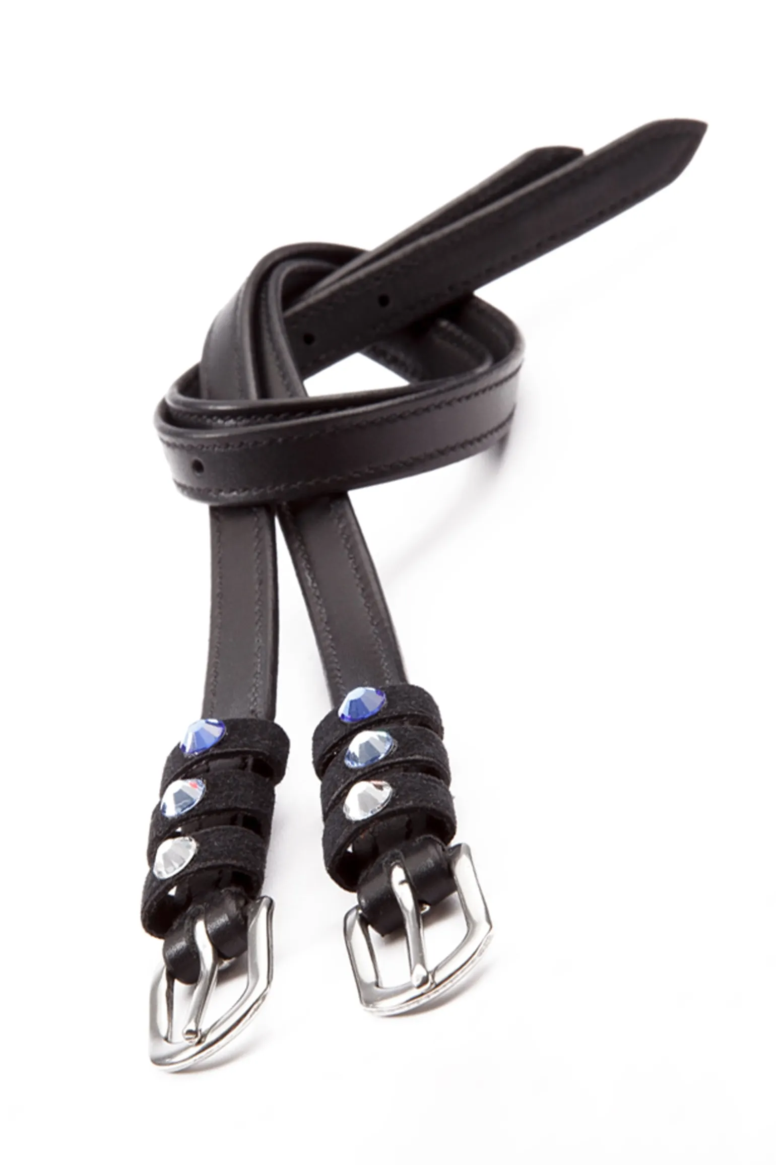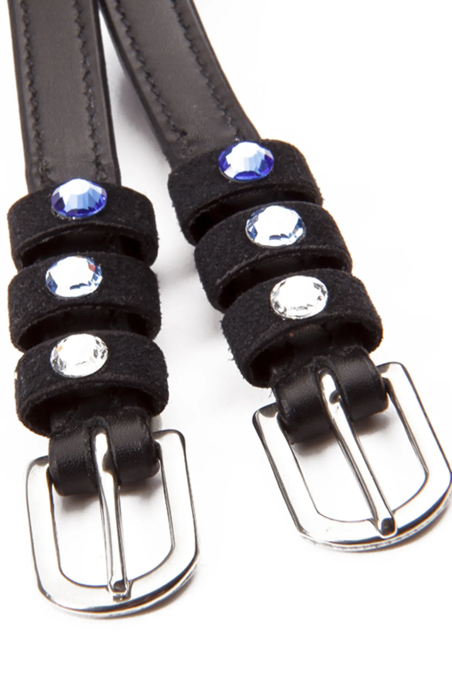 Sporenriemen „Seasons dreams“ aus weichem, langlebigem Qualitätsleder mit farbigen Strasssteinen auf den Schlaufen. Paarweise. Passendes Browband „Seasons dreams“ mit Knopfverschluss.