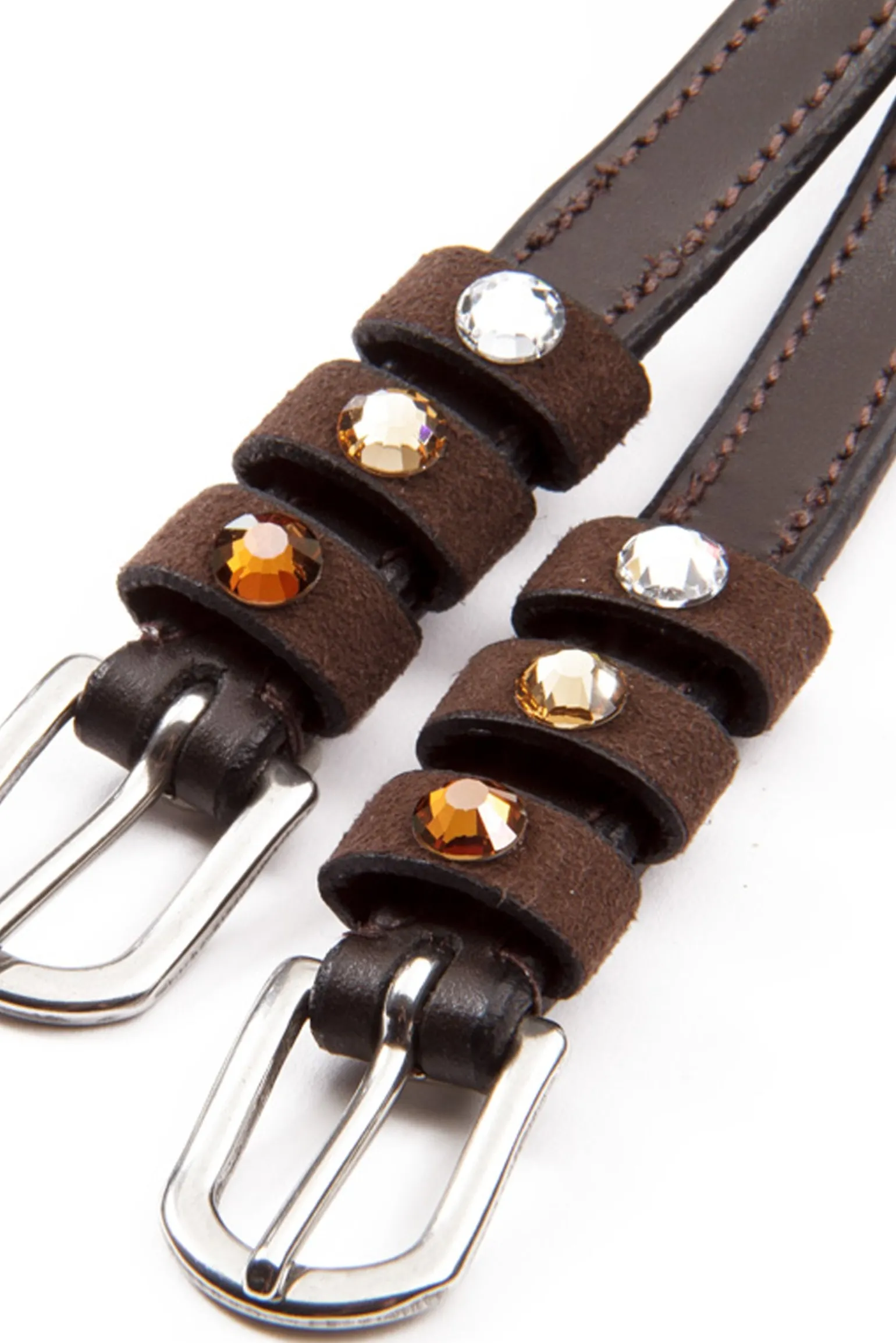 Sporenriemen „Seasons dreams“ aus weichem, langlebigem Qualitätsleder mit farbigen Strasssteinen auf den Schlaufen. Paarweise. Passendes Browband „Seasons dreams“ mit Knopfverschluss.