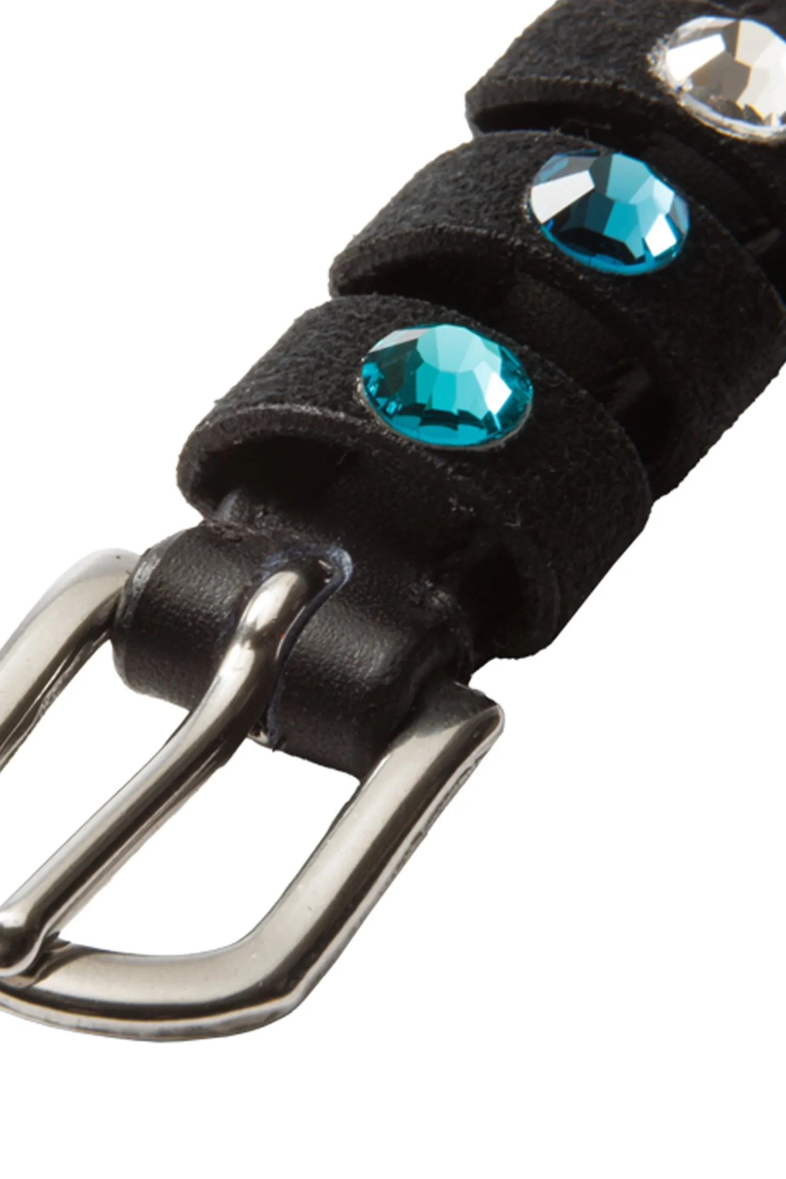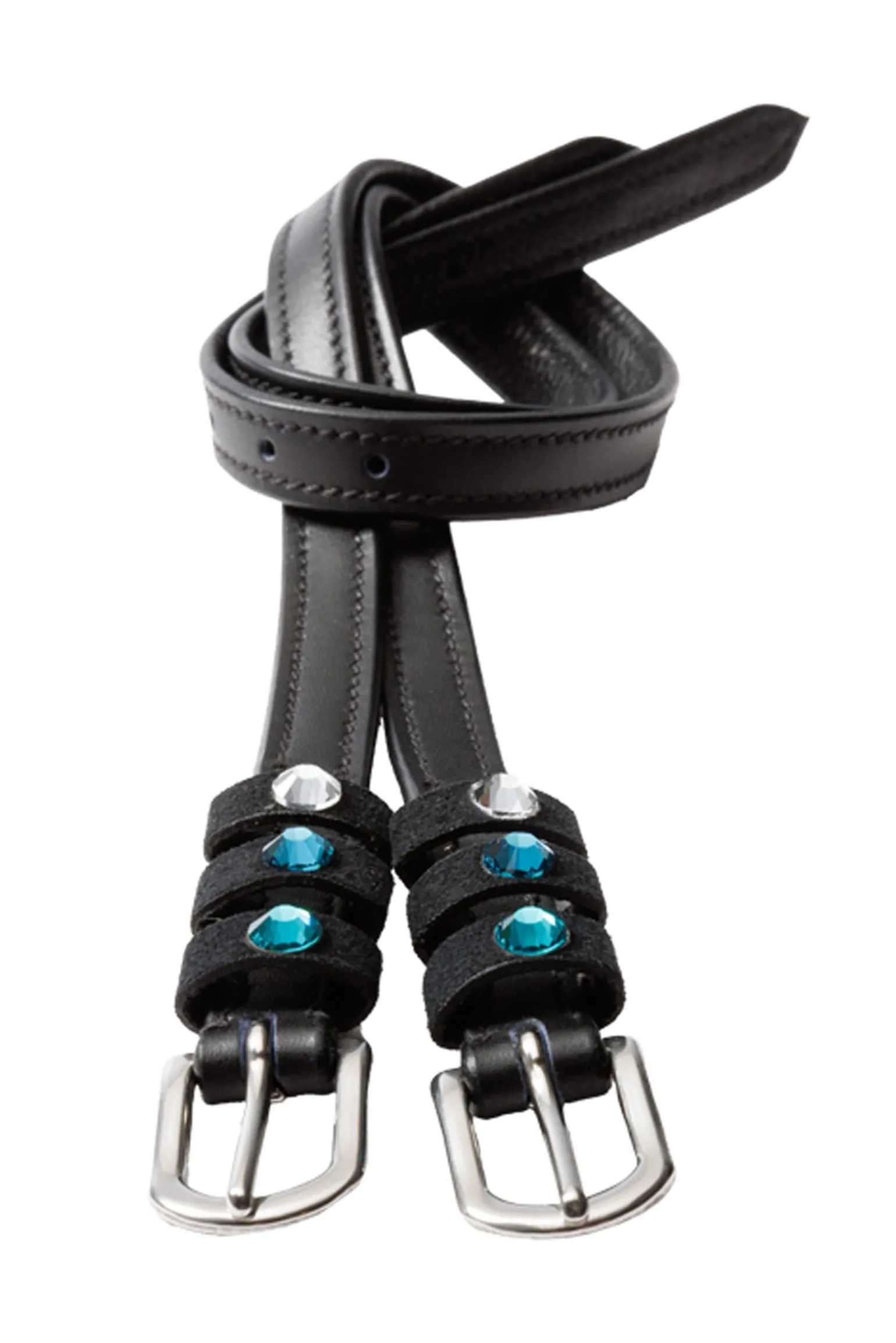 Sporenriemen „Seasons dreams“ aus weichem, langlebigem Qualitätsleder mit farbigen Strasssteinen auf den Schlaufen. Paarweise. Passendes Browband „Seasons dreams“ mit Knopfverschluss.