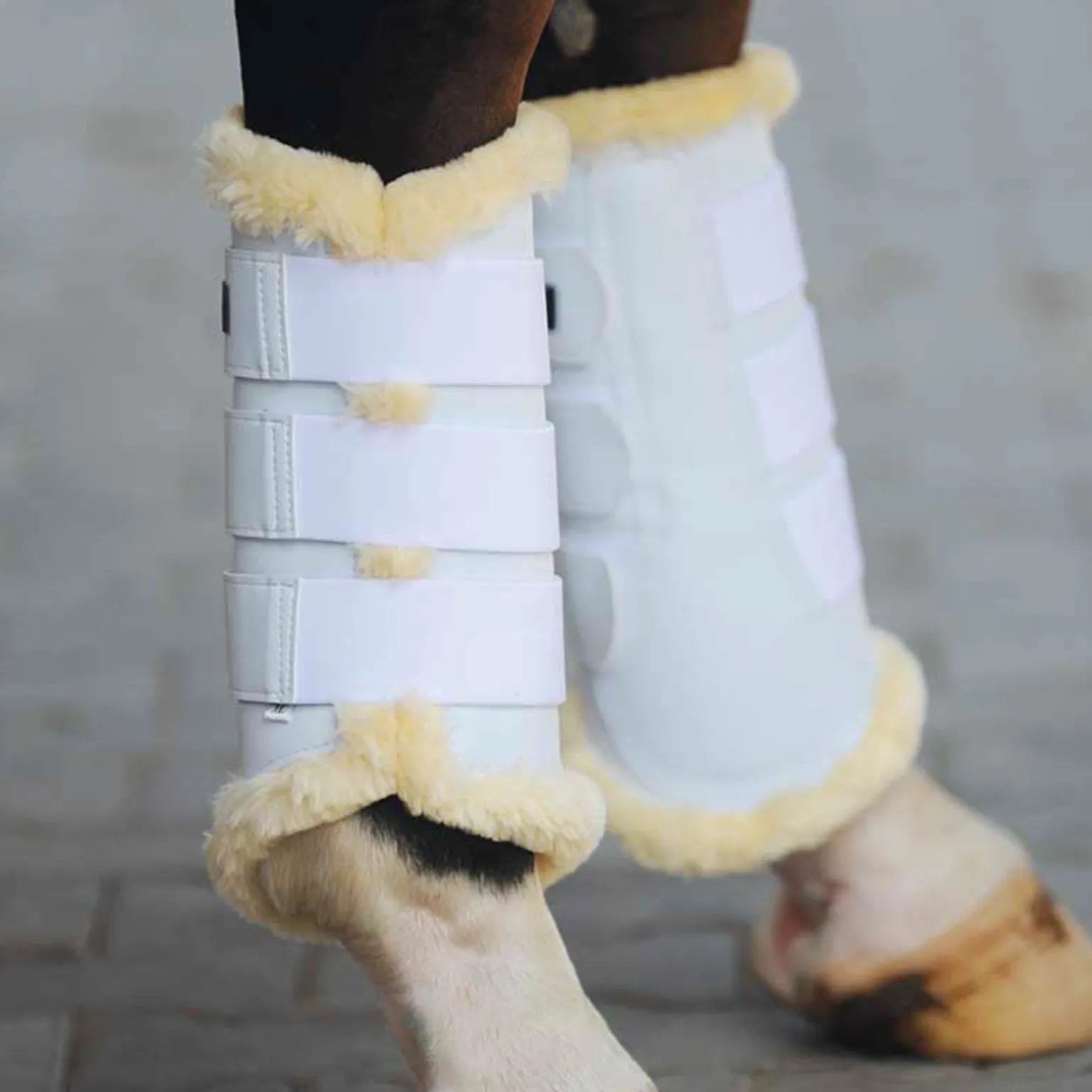 Robuste Gamasche mit Teddyfell-Innenseite und Kunstleder außen. 3 Klettverschlüsse mit Elast sorgen für einen optimalen Halt. Gleiches Modell für vorne und hinten, hinten eine Nummer größer nehmen.