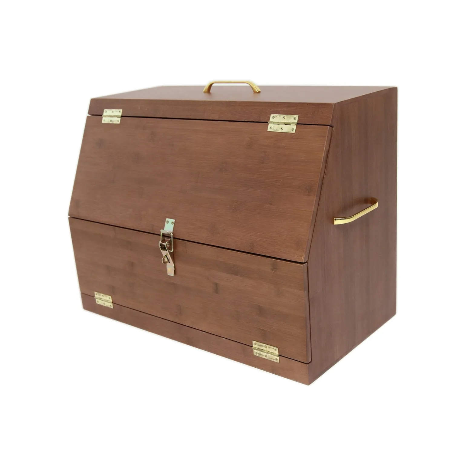 Sie ist 43,5 cm hoch, 59,5 cm breit und 32 cm tief. Die Box hat 2 Türen, die mit einem goldenen Schnappverschluss schließen, an dem Du ein Schloss anbringen kannst. Im Inneren befinden sich 2 kleine Schubladen (9,5 x 27,5 x 20 cm), eine größere Schublade (14 x 27,5 x 28,5 cm), ein großes Fach (28,5 x 28 x 29 cm) und ein kleineres Fach (8 x 28 x 28 cm). Alle Schubladen und der Boden des kleinen Fachs können entfernt werden. Das ist perfekt wenn Du mehr Platz brauchst oder die Box putzen möchtest. Sie besteht aus Bambus und ist dadurch besonders widerstandsfähig und leicht zu reinigen. Mit den 3 mitgelieferten goldenen Griffen lässt sich die Box leicht überall hin transportieren. Bring Stil in deine Organisation mit dieser Box.