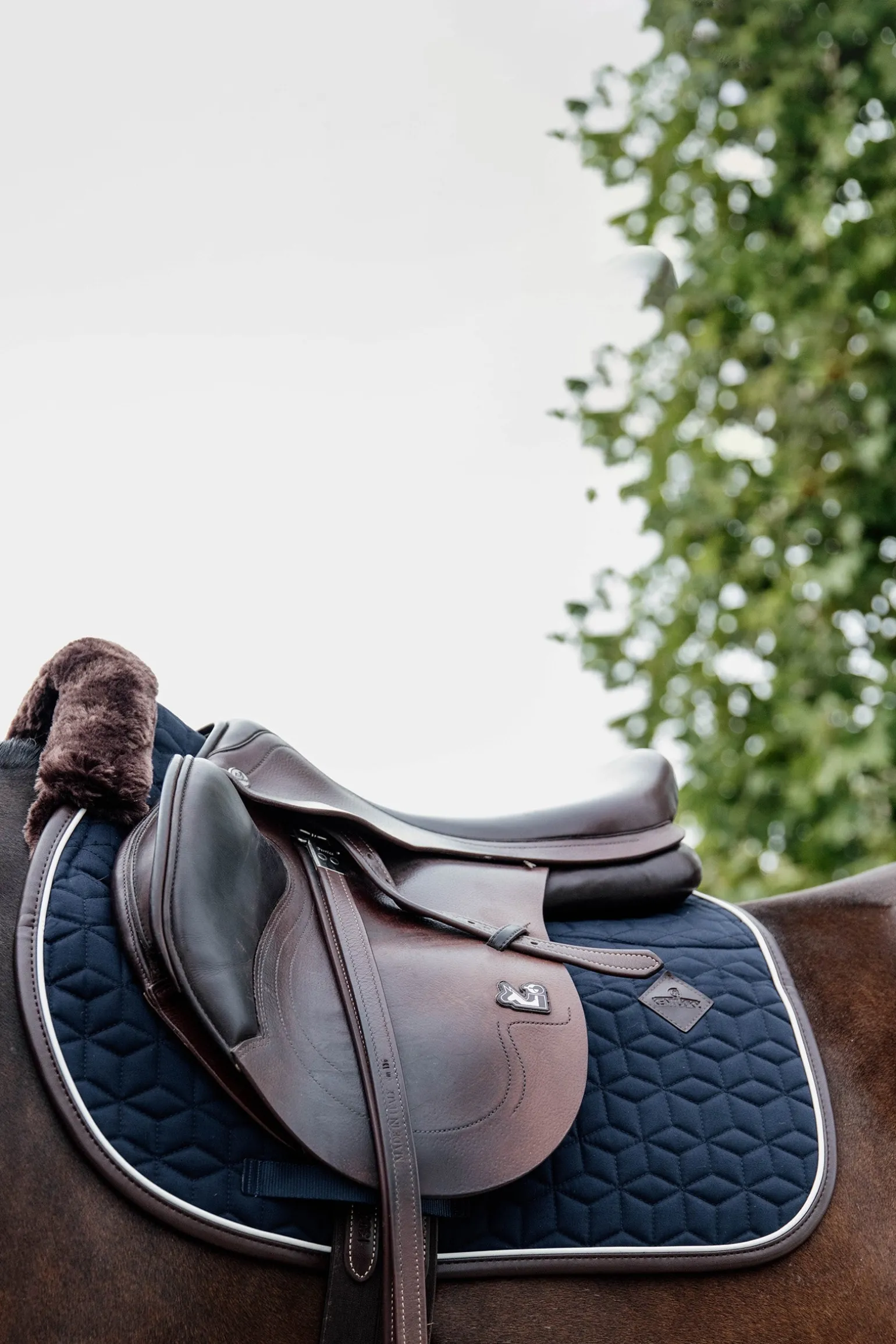 Die Schabracke hat keine nervigen Riemen an der Seite. Zum Befestigen der Schraken werden nur die Riemen für den Sattelgurt benötigt. Durch den künstlichen Lederrand und die weiße Biese wirkt die Schabracke besonders stillvoll und schick. Der einzigartige Look besticht durch dem gesteppten Sternmuster. Das dezente Logo aus Kunstleder befindet sich an einer zentralen, etwas höheren Stelle, sodass bei Bedarf immer Platz zum Besticken mit Ihrem eigenen Logo bleibt.