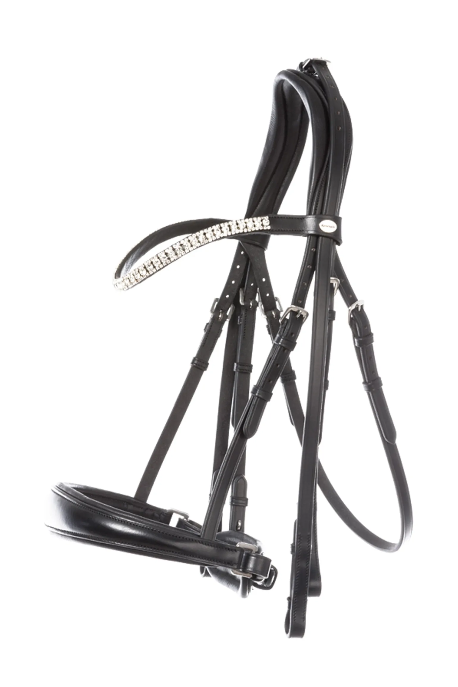 Die „Sonya“ Kandare besteht aus hochwertigem, pflanzlich gegerbtem Leder. Der Nasenriemen ist beidseitig verstellbar. Das gepolsterte und anatomisch geformte Genickstück sowie der schmal zulaufende, weich unterlegte Nasenriemen sorgen für zusätzlichen Komfort. Das schmale, geschwungene Stirnband ist mit weißen Strasssteinen verziert.