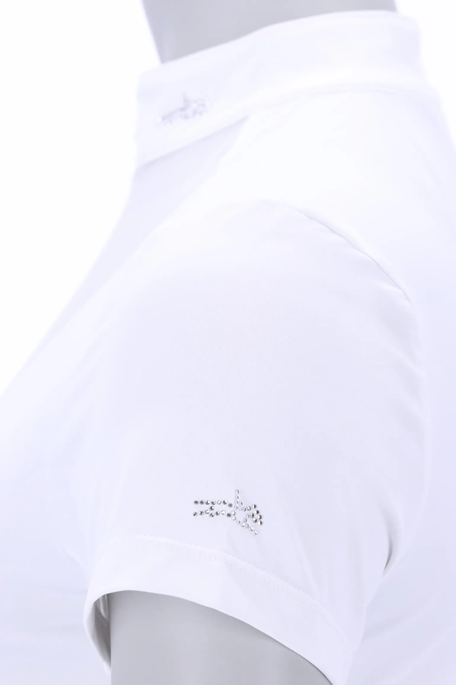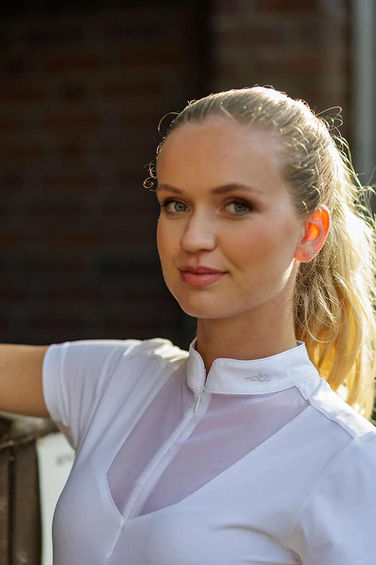 Das SPAnita Trainings- und Turniershirt vereint Funktionalität mit stilvollem Design! Dieses funktionale Shirt verfügt über eine „Cool Down“ Funktion, die hilft, die Temperatur während intensiver Aktivitäten zu regulieren. Der transparente Netzeinsatz im Vorderteil und unter dem Arm sorgt für verbesserte Belüftung und Atmungsaktivität. Ein verdeckt verlaufender Reißverschluss in der vorderen Mitte verleiht dem Shirt eine schlanke Optik, während der Stehkragen mit einem schicken Strass-Motiv dekoriert ist. Zusätzlich sorgt das Logo-Strass-Motiv auf dem oberen Rückenteil und dem linken Ärmel für elegante Akzente.