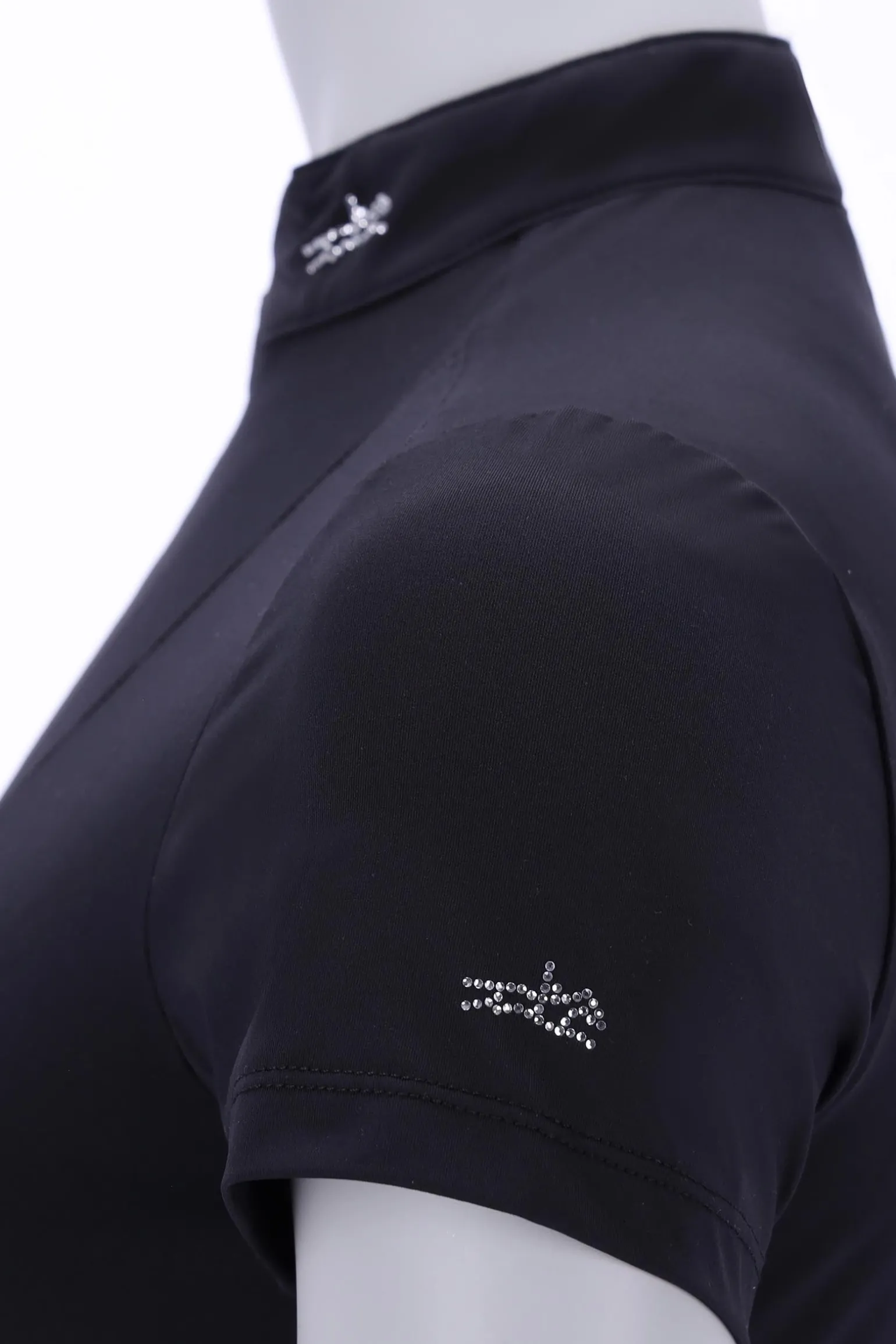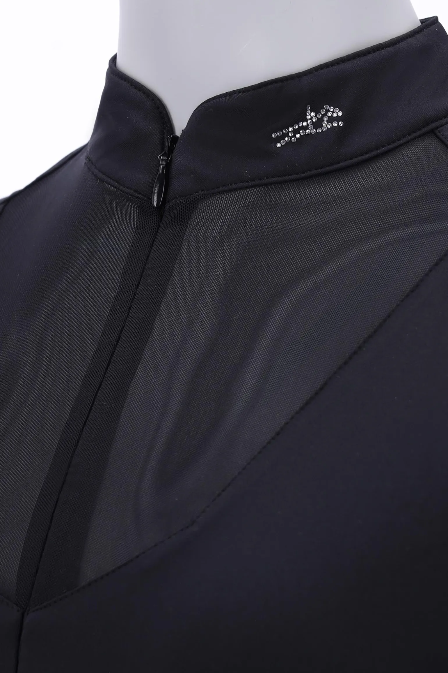 Das SPAnita Trainings- und Turniershirt vereint Funktionalität mit stilvollem Design! Dieses funktionale Shirt verfügt über eine „Cool Down“ Funktion, die hilft, die Temperatur während intensiver Aktivitäten zu regulieren. Der transparente Netzeinsatz im Vorderteil und unter dem Arm sorgt für verbesserte Belüftung und Atmungsaktivität. Ein verdeckt verlaufender Reißverschluss in der vorderen Mitte verleiht dem Shirt eine schlanke Optik, während der Stehkragen mit einem schicken Strass-Motiv dekoriert ist. Zusätzlich sorgt das Logo-Strass-Motiv auf dem oberen Rückenteil und dem linken Ärmel für elegante Akzente.