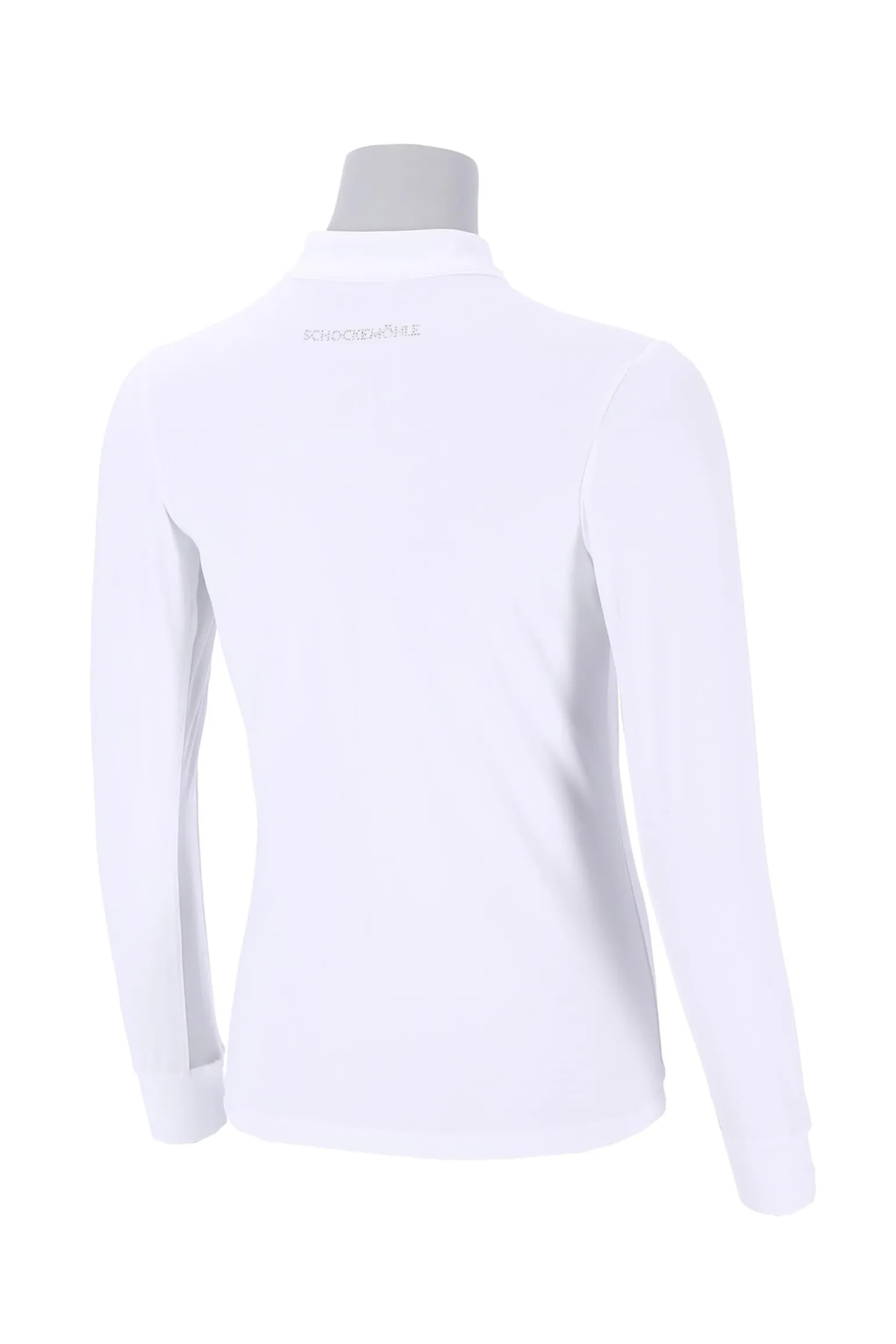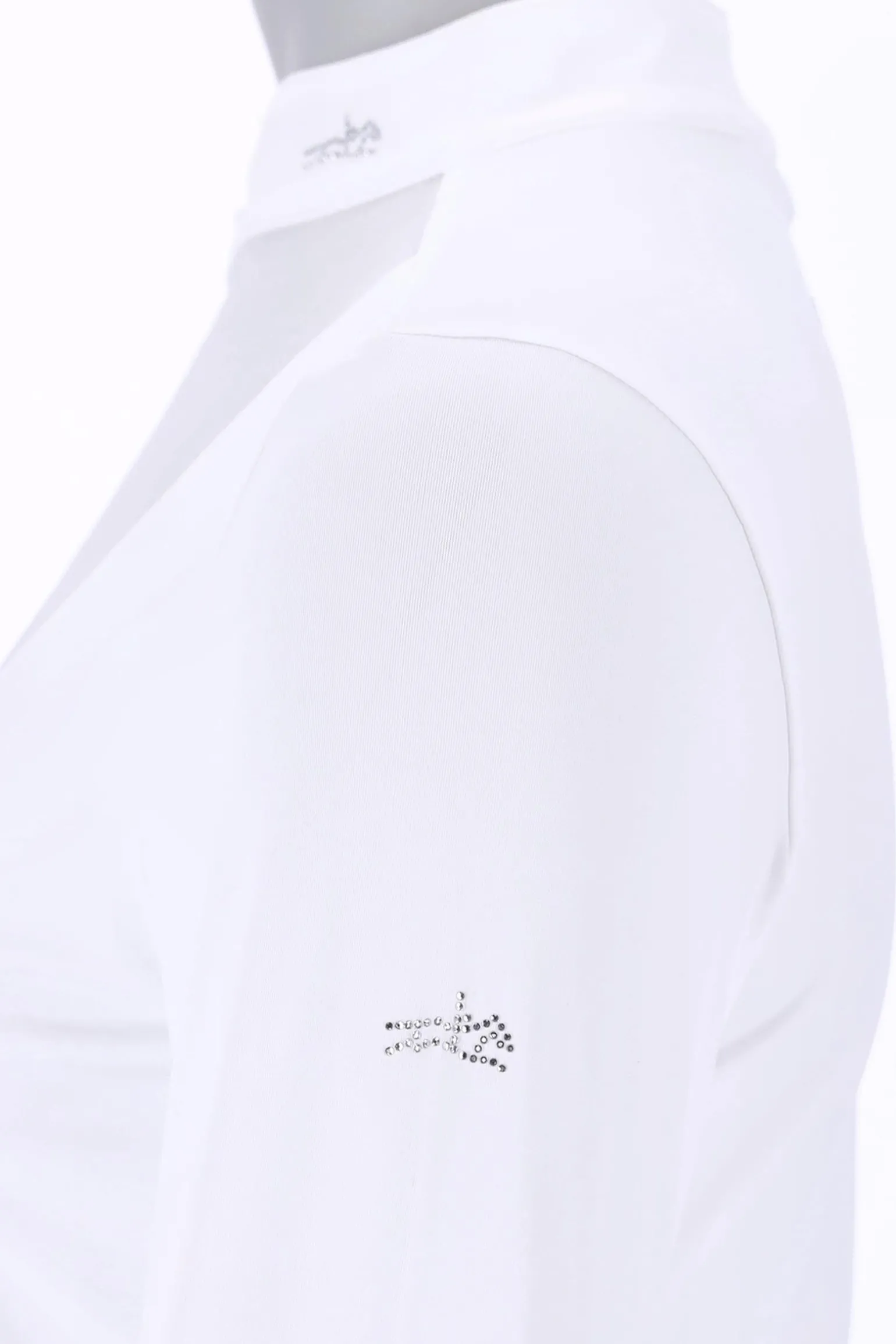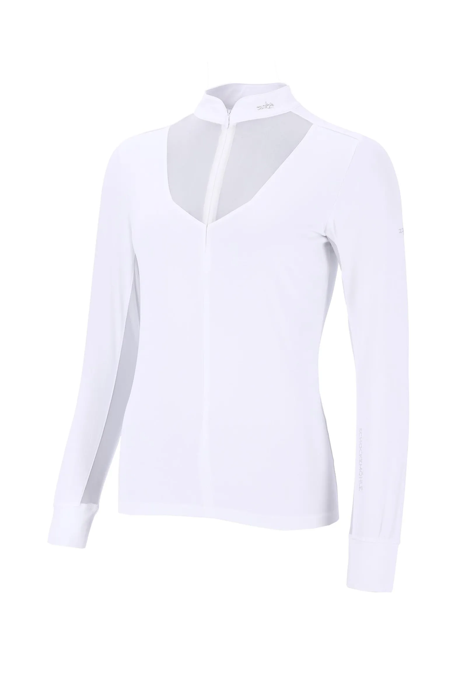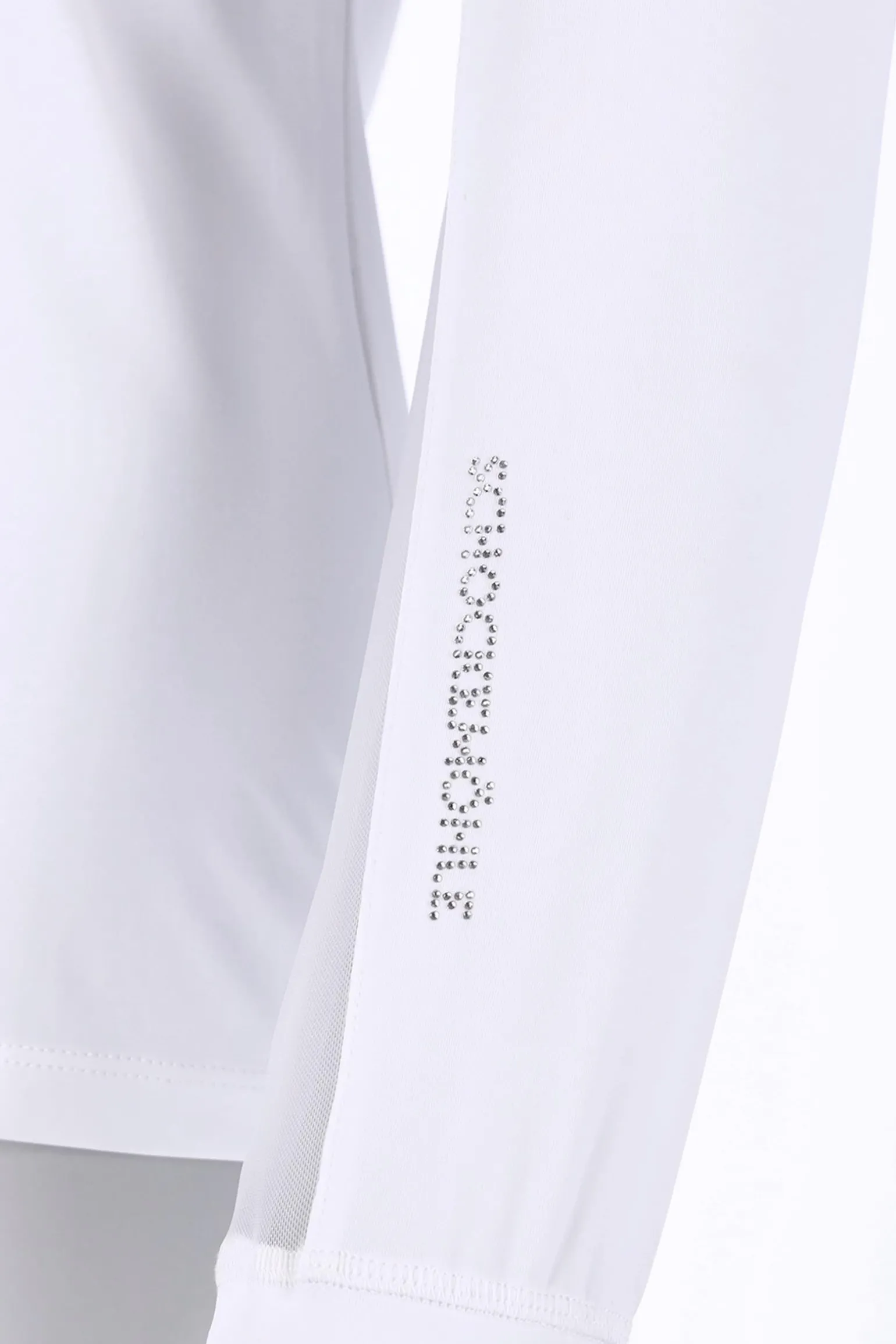 Das SPAnny Damen Turniershirt vereint Funktionalität mit modernem Stil! Dieses funktionale Turniershirt bietet eine innovative „Cool Down“ Funktion, die für optimale Temperaturregulation sorgt. Die 1/1 Ärmel mit Manschette gewährleisten eine bequeme Passform, während der transparente Netzeinsatz im Vorderteil und unter dem Arm für zusätzliche Belüftung sorgt. Ein verdeckt verlaufender Reißverschluss in der vorderen Mitte sorgt für eine schlanke Silhouette. Der Stehkragen ist mit einem eleganten Strass-Motiv verziert, das dem Shirt einen Hauch von Glamour verleiht. Das Logo-Strass-Motiv auf dem oberen Rückenteil und dem linken Ärmel setzt modische Akzente und rundet das Design ab.