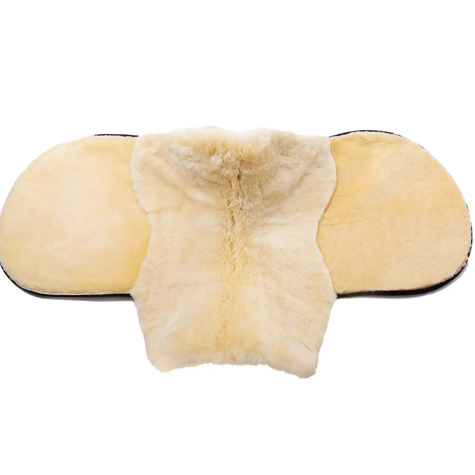 Die Unterseite wird komplett aus Lammfell mit 2 verschiedenen Wollhöhen gefertigt. Im Sitzbereich mit ca. 30 mm Wollhöhe, an den Seiten ca. 15 mm Wollhöhe für eine enge Verbindung zum Pferd. Befestigung mit Klettstrupfen an den Gurtriemen und Gurtführung am Blattende. Der eingearbeitete Nylonschutz verhindert das Aufscheuern im Bereich der Sattelgurtung. Vorne wird das Lammfell bis auf die Oberseite herumgezogen und dient als Sattelanlage.