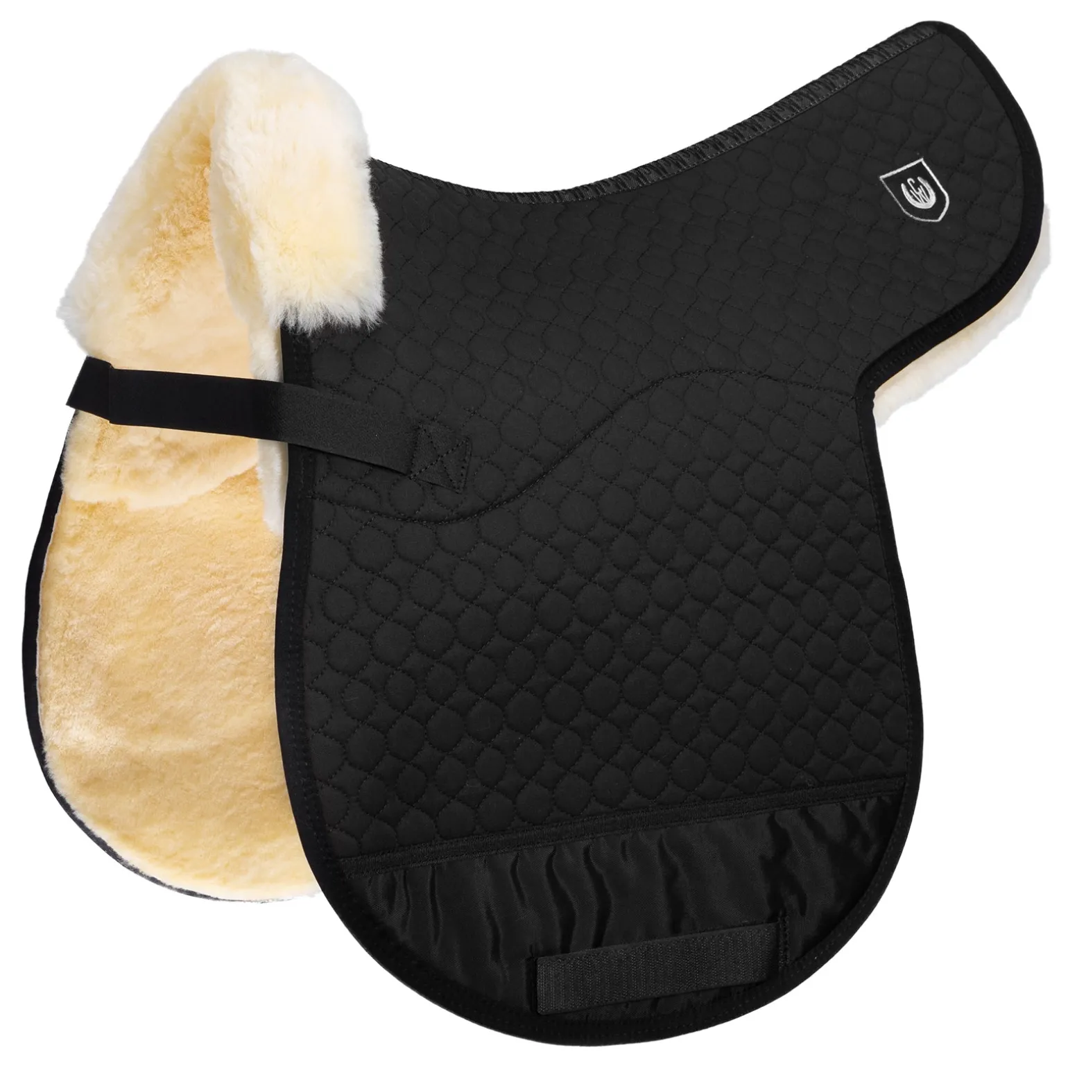 Die Unterseite wird komplett aus Lammfell mit 2 verschiedenen Wollhöhen gefertigt. Im Sitzbereich mit ca. 30 mm Wollhöhe, an den Seiten ca. 15 mm Wollhöhe für eine enge Verbindung zum Pferd. Befestigung mit Klettstrupfen an den Gurtriemen und Gurtführung am Blattende. Der eingearbeitete Nylonschutz verhindert das Aufscheuern im Bereich der Sattelgurtung. Vorne wird das Lammfell bis auf die Oberseite herumgezogen und dient als Sattelanlage.
