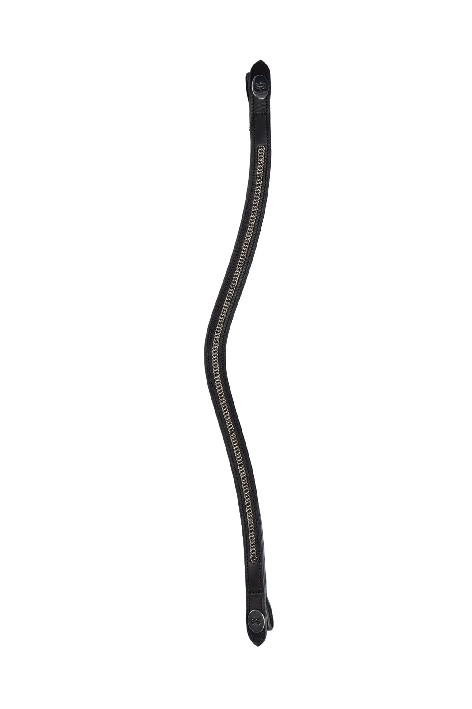 Leder-Stirnband mit Click It™ und silberfarbener Kette in der Mitte. Eine stilvolle neue Ergänzung der Kollektion mit einer markanten Metallkette zwischen zwei Lederreihen. U-förmiges Stirnband aus hochwertigem Vollnarbenleder. Integrierte Kette mit Kristallen in unterschiedlichen Nuancen. Das patentierte Click It™-Design ermöglicht den Austausch des Stirnbands in wenigen Sekunden, selbst wenn die Trense noch am Pferd ist. Dank des Click It™-Designs kann das Stirnband an allen Trensen in Standardgröße (32 mm/1,25”) verwendet werden.