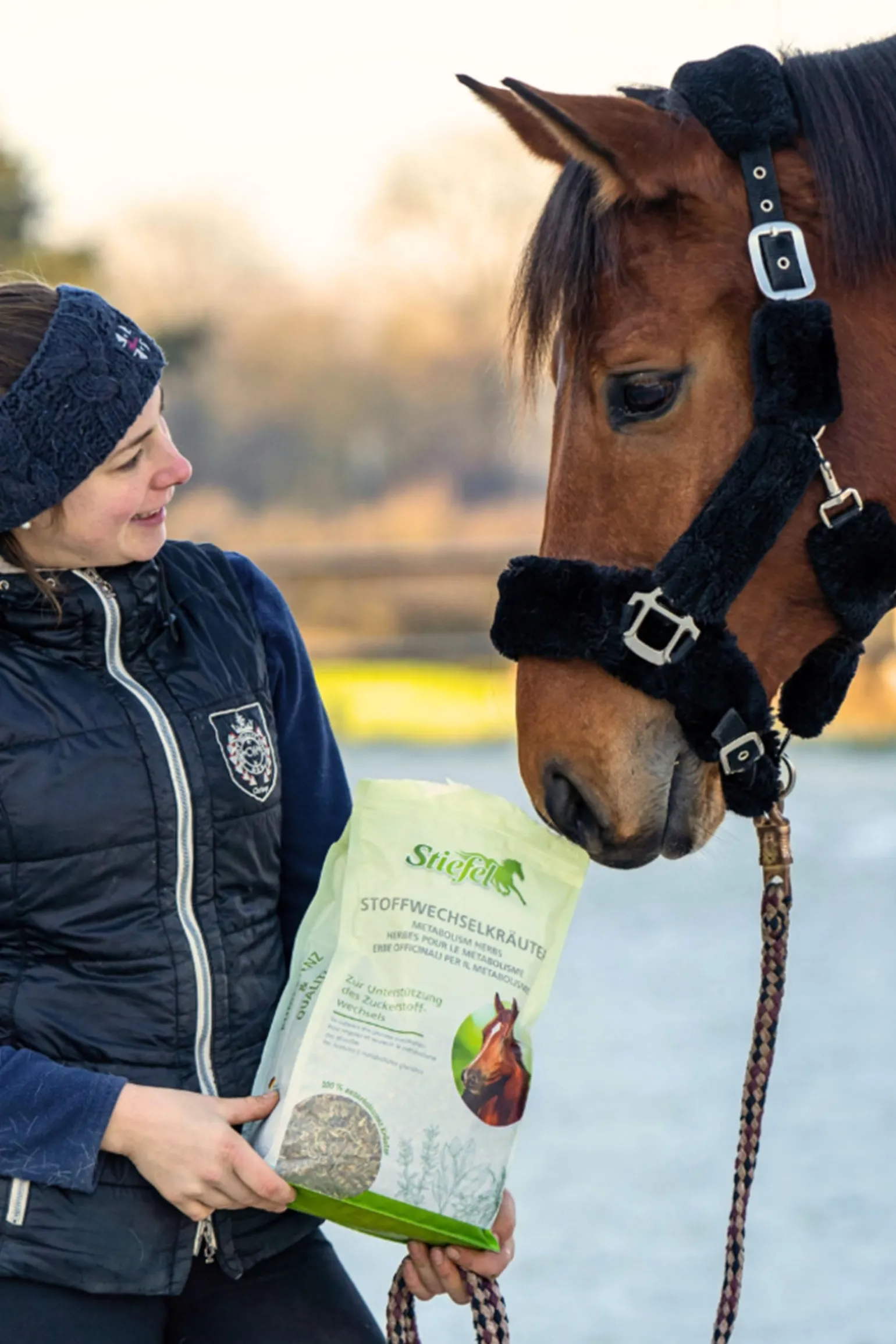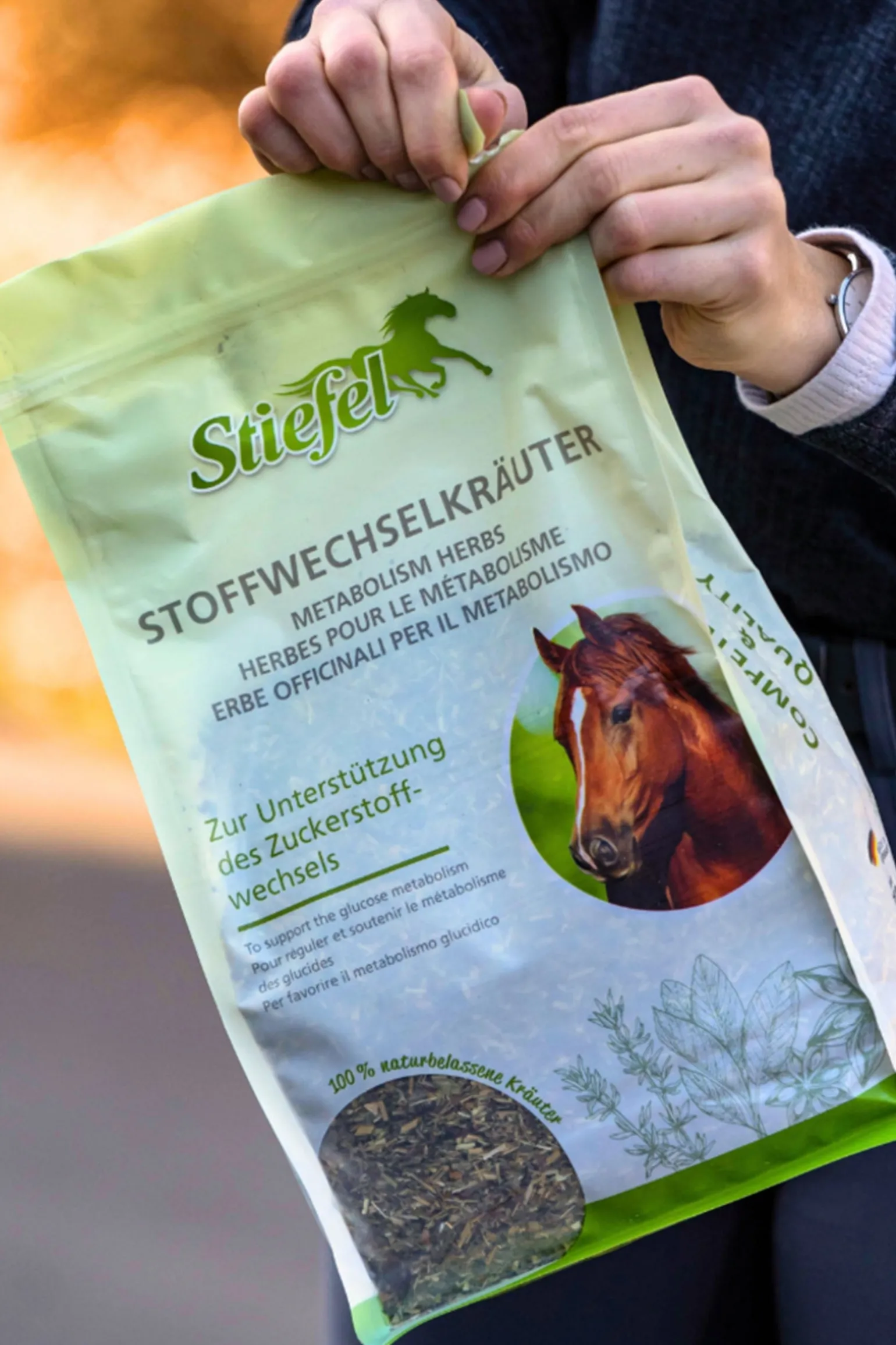 Stiefel Stoffwechselkräuter sind eine speziell ausgewählte, naturbelassene Kräutermischung zur Unterstützung des Zuckerstoffwechsels beim Pferd. Die Kräutermischung kann den Stoffwechsel von Kohlenhydraten, insbesondere die Verwertung von Zucker, optimieren. Fütterungshinweis: Großpferde (600 kg KGW) 60 g / tägl., Kleinpferde 30 g / tägl. (1 geh. Esslöffel = ca.8 g). Trocken oder aufgebrüht mit dem Sud unter das Futter mischen. Empfohlene Fütterungsdauer: 90 Tage. Je nach Bedarf die Anwendung wiederholen. Bei erhöhtem Bedarf kann die Dosierung verdoppelt werden.