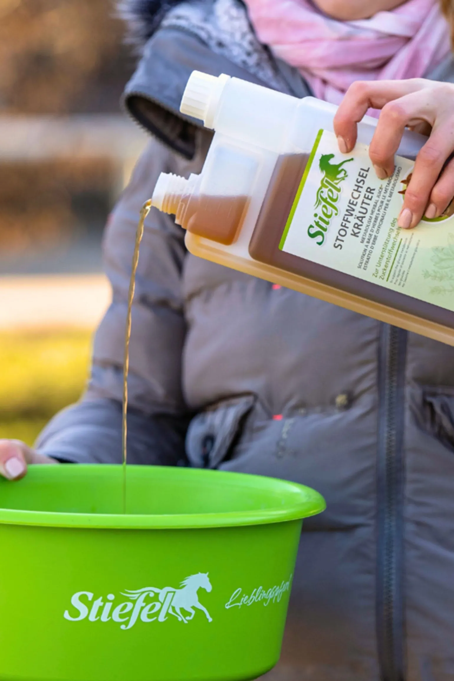 Stiefel Stoffwechselkräutersaft ist ein Kräutersaft aus einer natürlichen Kräutermischung ohne künstliche Aromastoffe zur Unterstützung des Zuckerstoffwechsels beim Pferd. Die Kräutermischung kann den Stoffwechsel von Kohlenhydraten, insbesondere die Verwertung von Zucker, optimieren. Hinweis: Anwendung bei trächtigen Stuten nur in Rücksprache mit dem Tierarzt. Stiefel Kräutersäfte sind vegan, ohne Zuckerzusatz, ohne Farbstoffe, ohne künstliche Aromastoffe und made in Germany. Fütterungshinweis: Großpferde (600 kg KGW) 70 ml / tägl., Kleinpferde 35 ml / tägl. Tagesdosis kann auf zwei Portionen pro Tag aufgeteilt werden. Fütterungsdauer: Mind. 14 Tage. Fütterungsdauer von bis zu 6 Wochen empfehlenswert.