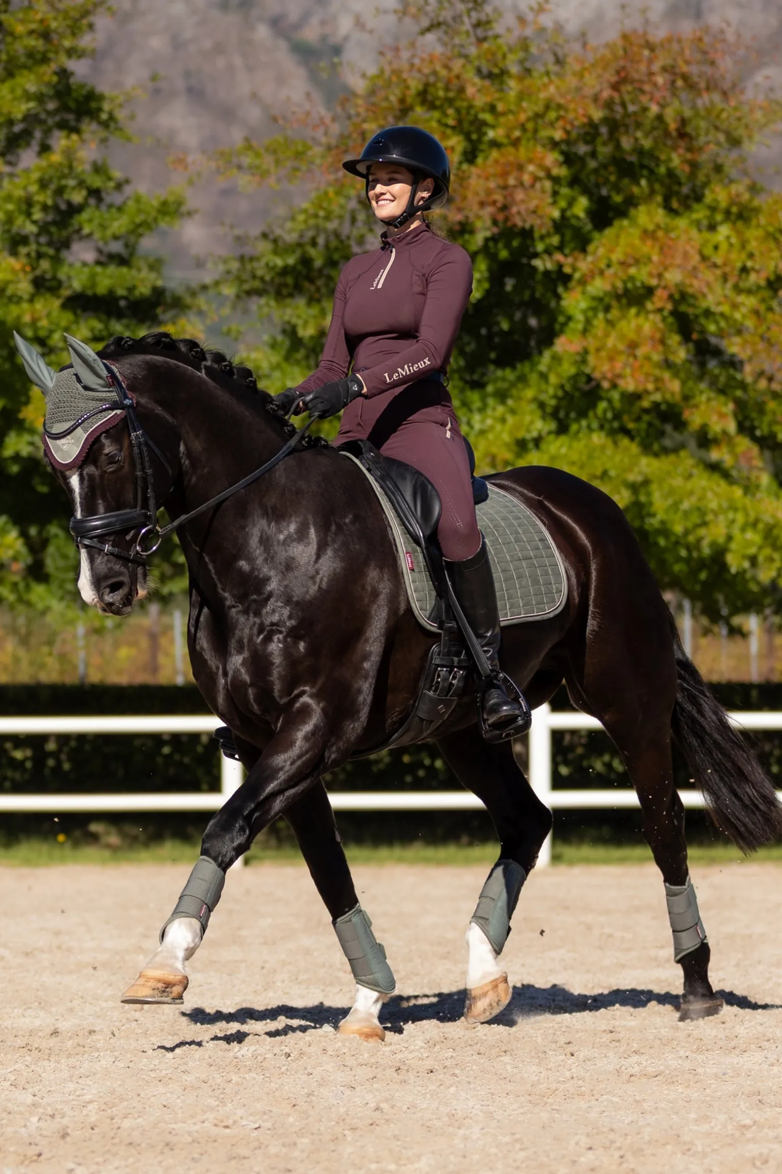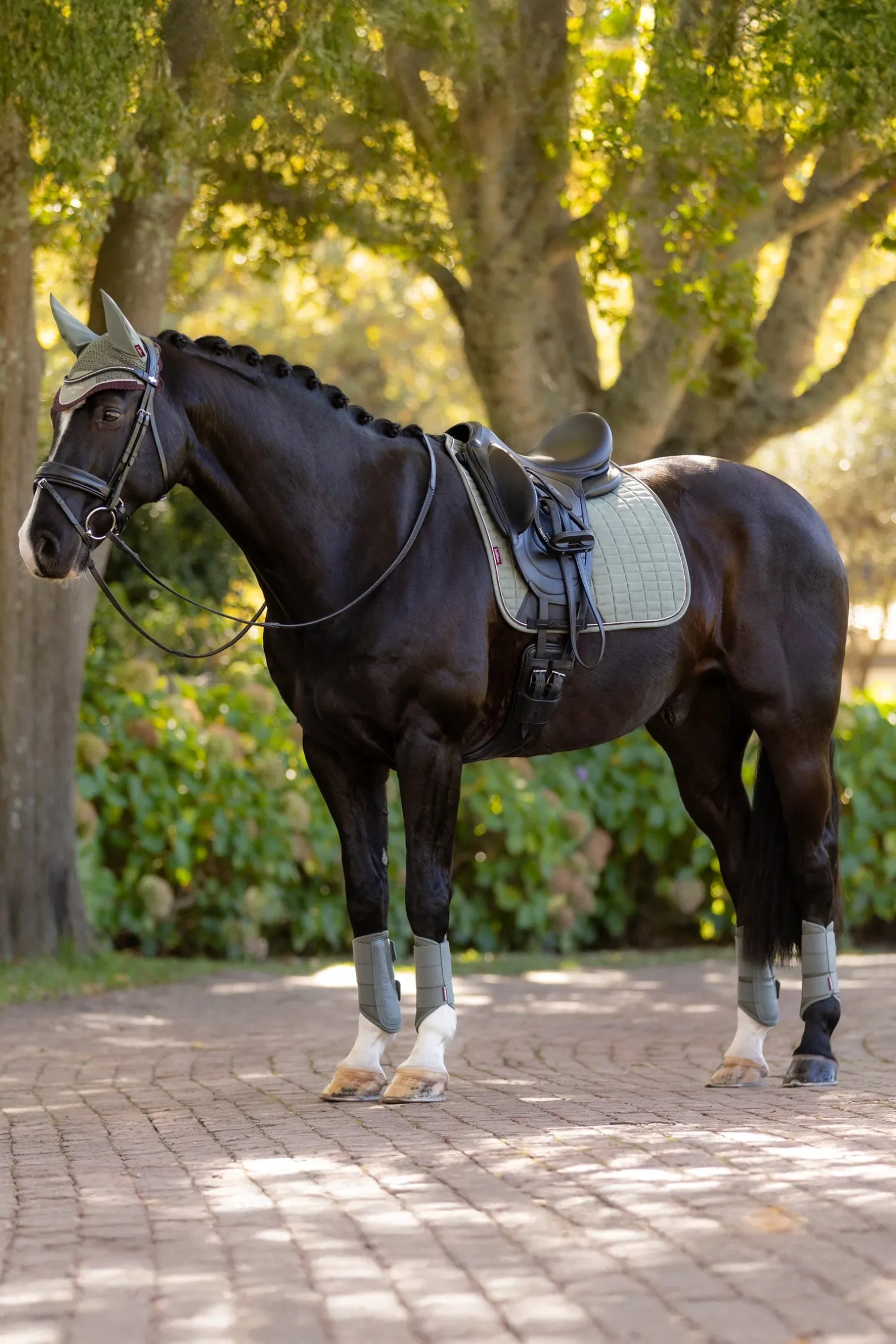 Die Schabracke besteht außen aus einer luxuriösen Wildlederartigen Oberfläche in einer großen Auswahl an Farben. Die innen liegende Bambusfütterung kontrolliert und absorbiert Feuchtigkeit unter dem Sattel. Die Schabracke ist wunderbar komfortabel und minimiert Reibung. Sie verfügt über einen klassischen Dressur-Schnitt mit hohem Widerrist, elastischen D-Ringen und Gurt-Schutz mit innen versteckten Schlaufen, der ein Rutschen verhindert. Kann mit den passenden Polo Bandagen und Fliegenhauben kombiniert werden.