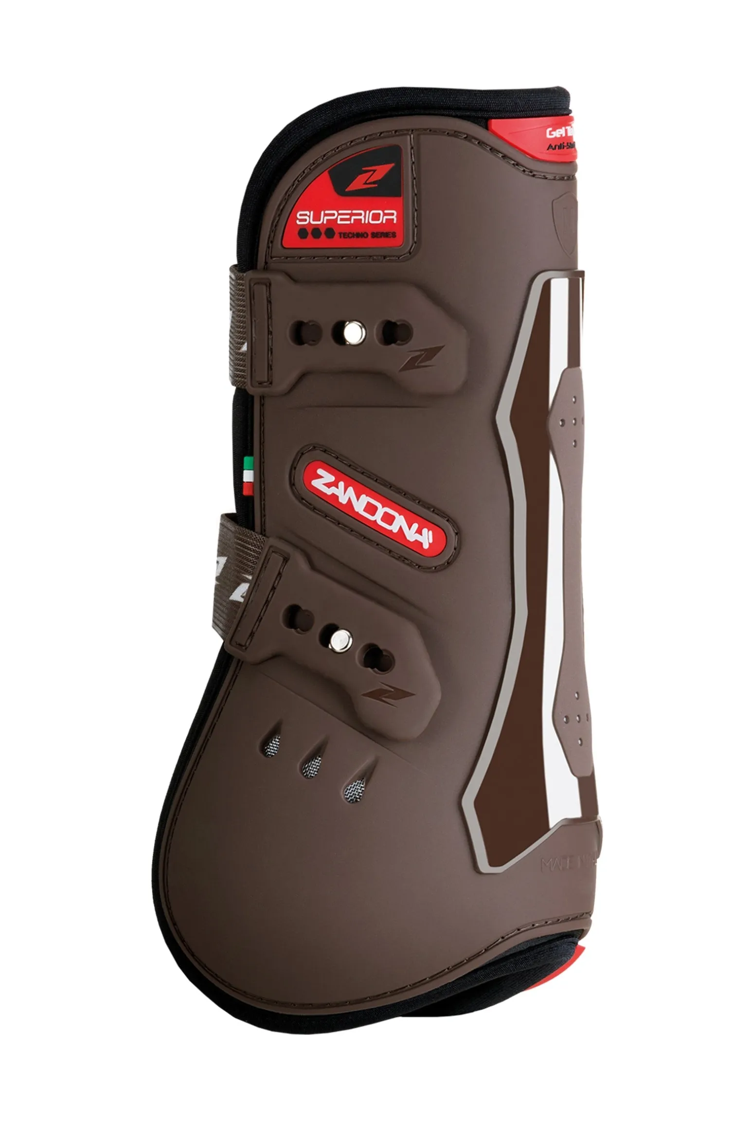 Die in Italien hergestellten Gamaschen „SUPERIOR Tendon“ wurden speziell entwickelt, um bei Springpferden Ergüsse und Prellungen im Fesselbereich der Vorhand und am Röhrbein zu vermeiden und die Sehnen zuverlässig zu schützen. Sie setzen sich zusammen aus äußeren TPU-Schichten mit unterschiedlichen Stärken und sind atmungsaktiv dank des perforierten Neoprengewebes. Zudem werden sie durch 6 Luftöffnungen, die über der Fessel angeordnet sind, belüftet. Gel-Tech befindet sich an den erforderlichen Bereichen zwischen dem TPU-Gewebe und der Neopren-Schutzschicht und wirkt hier als Stoßdämpfer und bequeme Polsterung. An der Innenseite, nahe am langen Fesselknochen, wurde eine Flex-Zone eingearbeitet, die notwendig ist, um der Gliedmaße eine maximale Bewegungsfreiheit zu garantieren. Die elastischen Bänder mit Schnellverschluss-Spitze wurden so justiert, dass ein sicherer Verschluss stets gewährleistet ist. Sie sind eigens zu diesem Zweck mit einem doppelten Verschlusssystem ausgestattet (horizontal und vertikal). Die Abmessungen und die perfekte ergonomische Form wurden entwickelt, indem man die tatsächliche Struktur der Gliedmaße kopierte – dies garantiert eine perfekte Anpassung und verhindert Beanspruchungen jeglicher Art..