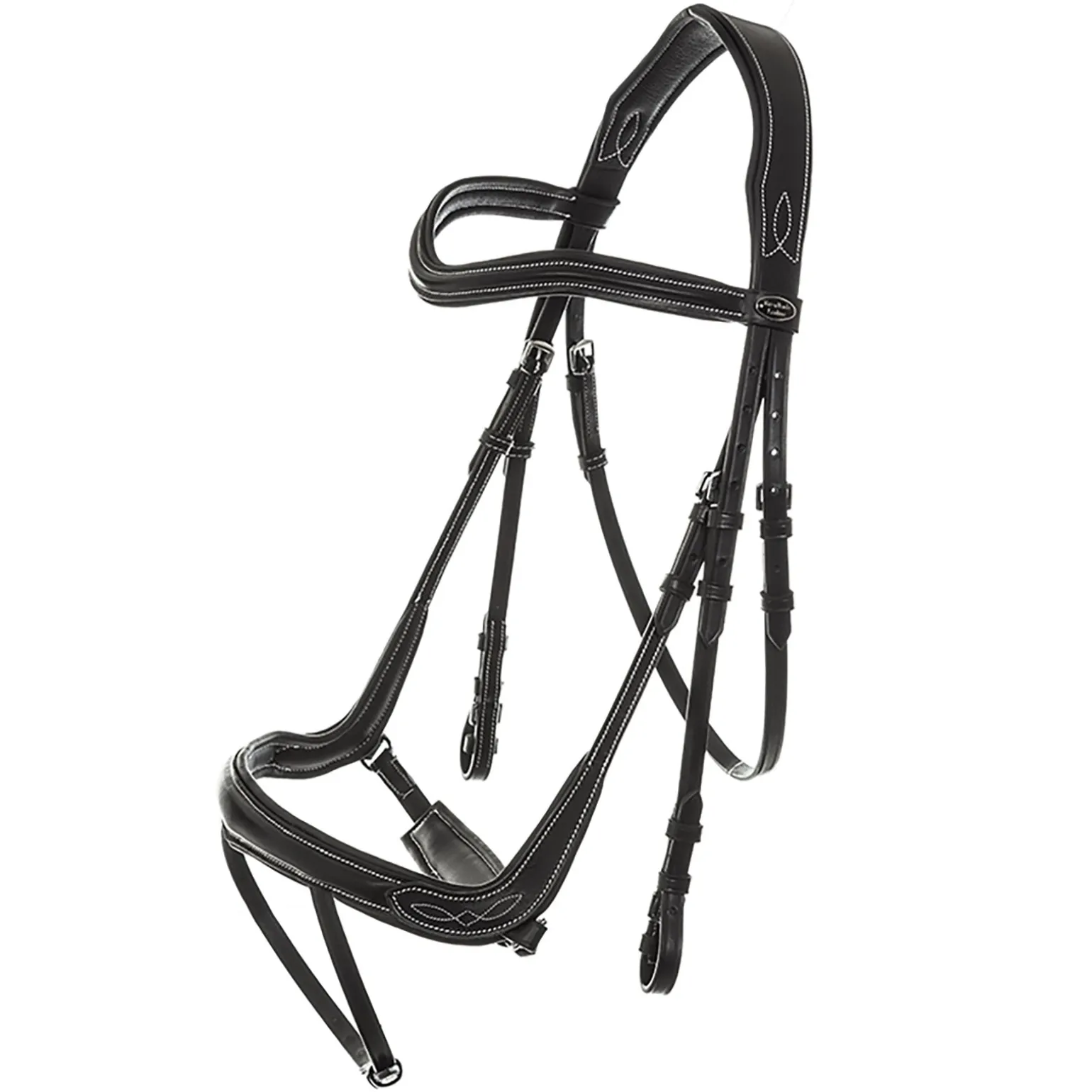 Englische Trense mit anatomischem Genickstück, geschwungenem Nasenriemen und Gummizügeln.