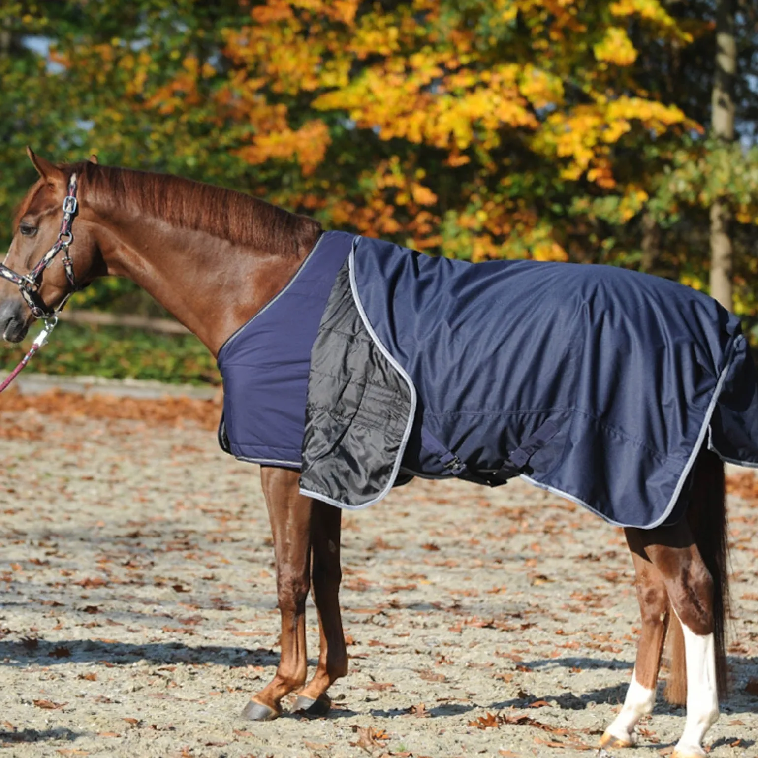 Bequeme und atmungsaktive Unterdecke aus Polyester mit idealer Passform und großrahmiger Steppung. Brustbereich mit glattem Polyesterfutter ausgestattet. Der Widerrist ist mit Kunstfell unterlegt. Eine Brustschnalle und tiefer Schweifriemen. 150g Wattefüllung.