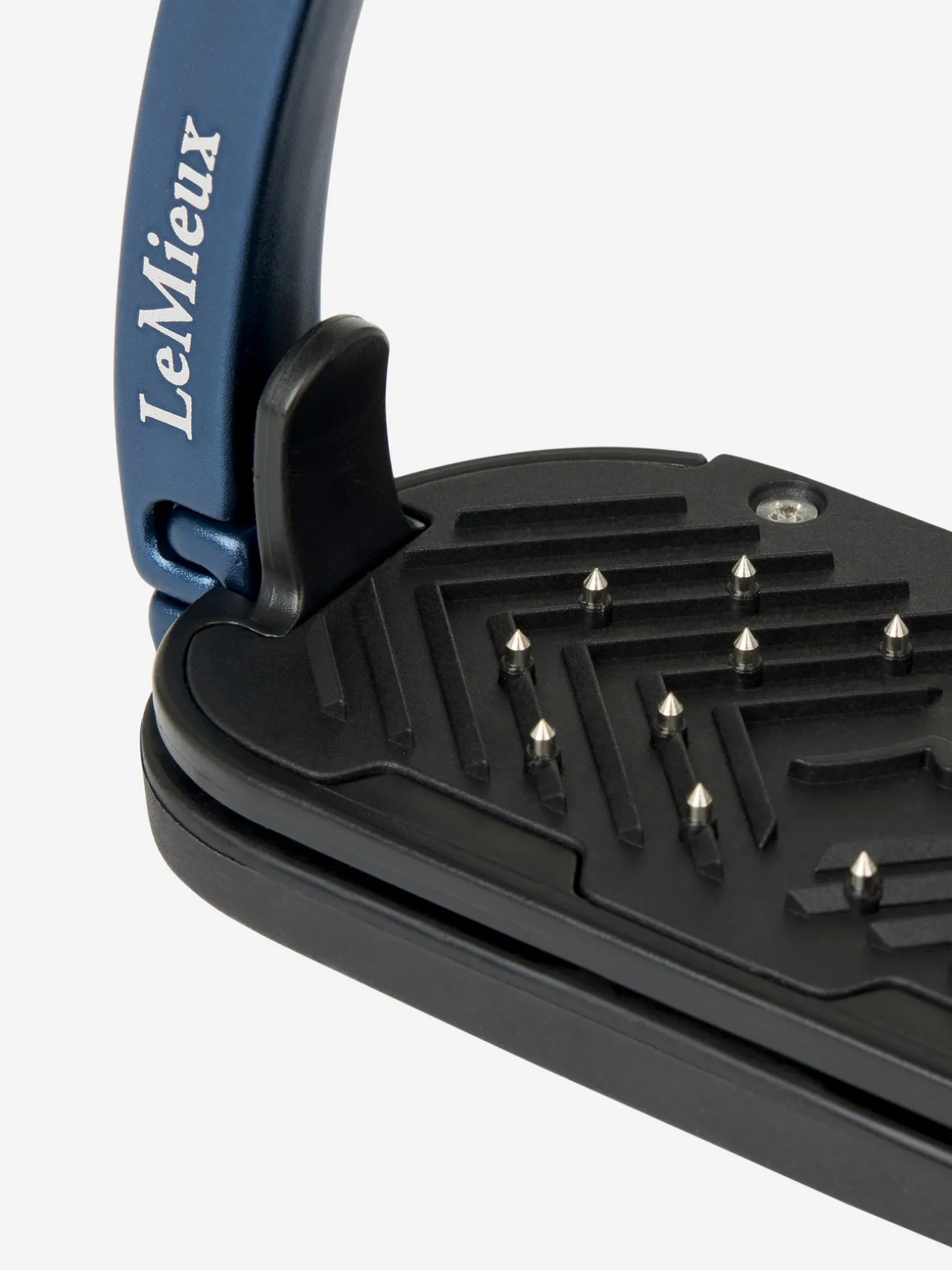 Ein integrierter Sicherheitsarm verfügt über ein zweistufiges Auslösesystem, das ein ungewolltes Öffnen verhindert. Der federbelastete Sicherheitsarm rastet in der Basis des Hauptrahmens ein, was bedeutet, dass bei hoher Belastung wie beispielsweise der Landung nach einem Sprung, das Gewicht des Reiters gleichmäßig auf den Steigbügel verteilt wird. Wenn Druck auf den Steigbügelarm ausgeübt wird, wie z. B. bei einem Sturz, löst sich der Arm, so dass der Fuß nicht im Steigbügel hängen bleibt. Die Auslösekraft des Steigbügelarms beträgt im Test 36N (entspricht 3,62kg), d.h. genug Widerstand, um ein unbeabsichtigtes Öffnen zu verhindern, aber ein sicheres Auslösen im Falle eines Sturzes des Reiters zu gewährleisten.