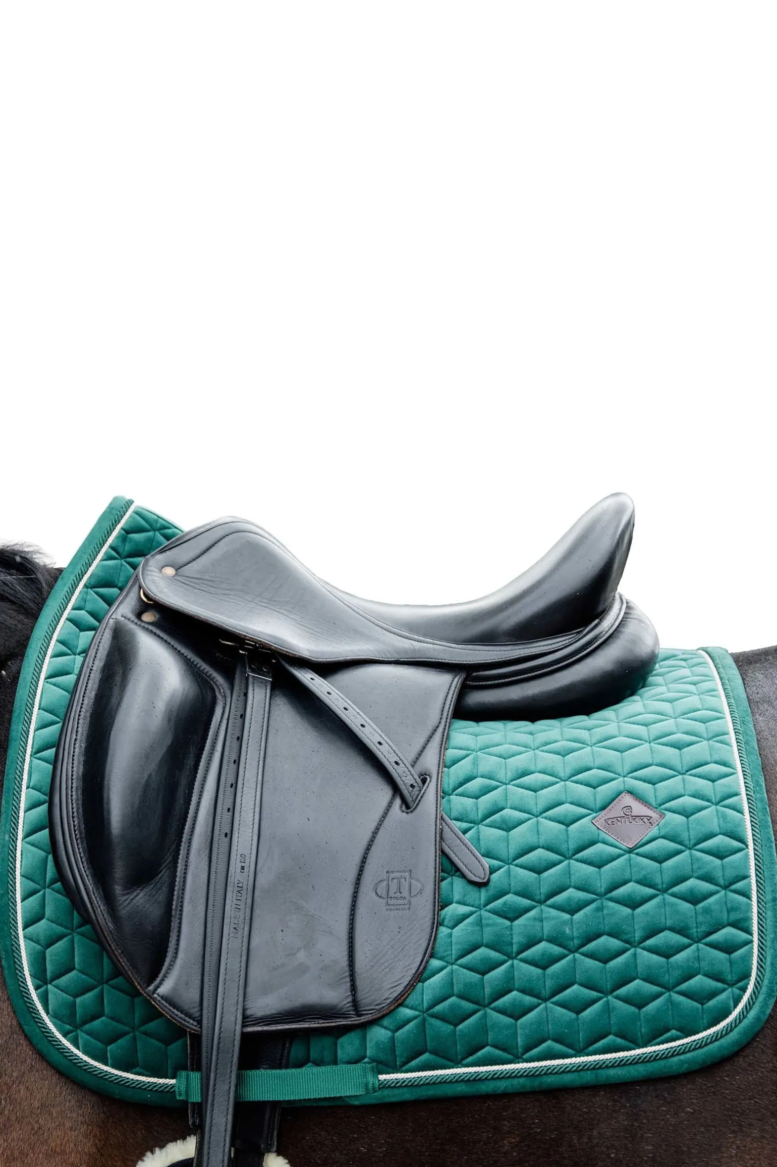 Super stylische und stilvolle Schabracke aus Samt mit doppelt gedrehter Bordüre. Die Samtschabracke ist für die Dressur designed und bietet hervorragende Polsterung zwischen dem Rücken des Pferdes und dem Sattel und schützt gleichzeitig vor Verspannungen. Die Schabracke hat keine lästigen Schlaufen zur Befestigung am Sattel, sondern nur einen Nylonriemen für den Gurt. Das dezente Logo aus Kunstleder ist immer an einer zentralen, etwas höheren Stelle platziert, so dass bei Bedarf immer Platz für die Bestickung mit ihrem eigenen Logo verfügbar ist.