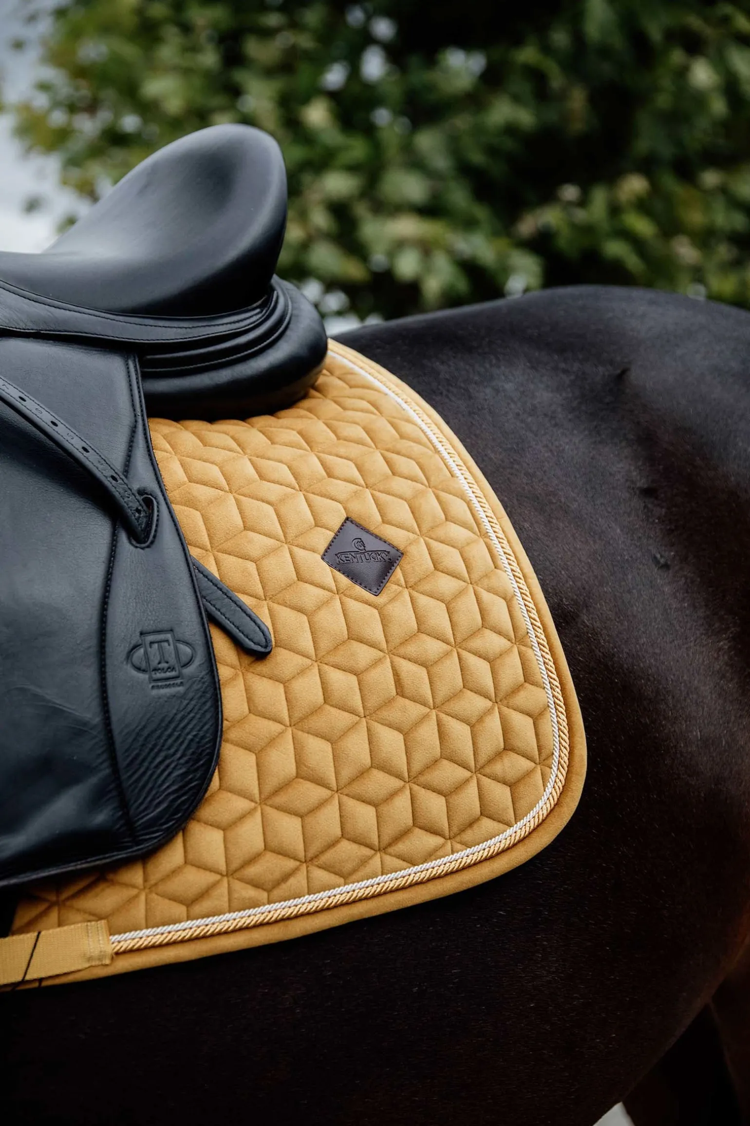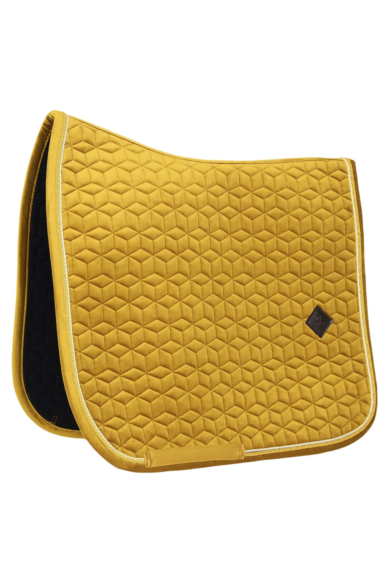 Super stylische und stilvolle Schabracke aus Samt mit doppelt gedrehter Bordüre. Die Samtschabracke ist für die Dressur designed und bietet hervorragende Polsterung zwischen dem Rücken des Pferdes und dem Sattel und schützt gleichzeitig vor Verspannungen. Die Schabracke hat keine lästigen Schlaufen zur Befestigung am Sattel, sondern nur einen Nylonriemen für den Gurt. Das dezente Logo aus Kunstleder ist immer an einer zentralen, etwas höheren Stelle platziert, so dass bei Bedarf immer Platz für die Bestickung mit ihrem eigenen Logo verfügbar ist.