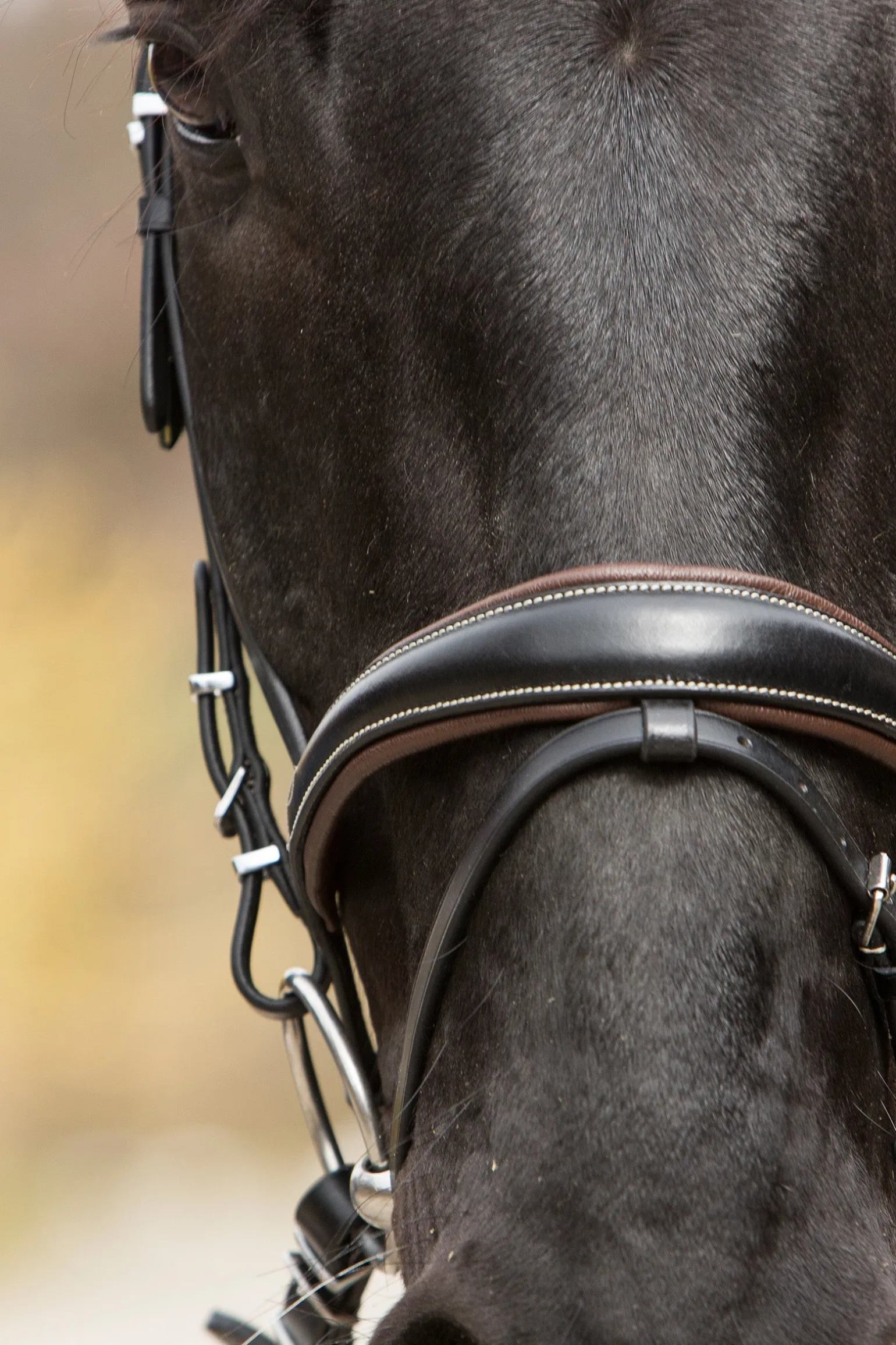 Trensenzaum Vera ist pferdefreundlich und ein Schmuckstück zugleich. Mit Hilfe des breiter geschnittenen, anatomisch geformten Kopfstücks wird der Druck im Genick vermindert und gleichzeitig ist ausreichend Bewegungsspielraum für die Ohren gegeben. Für noch mehr Komfort sind Kopfstück und Reithalfter mit einer weichen Polsterung ausgestattet. Die Kombination von schwarzem und braunem Leder in Stirn- und Nasenband, cremefarbenen Ziernähten und weiteren schönen Details, wie den eleganten silbernen Metallschlaufen im Bereich der Schnallen, machen aus dieser Trense etwas Besonderes.