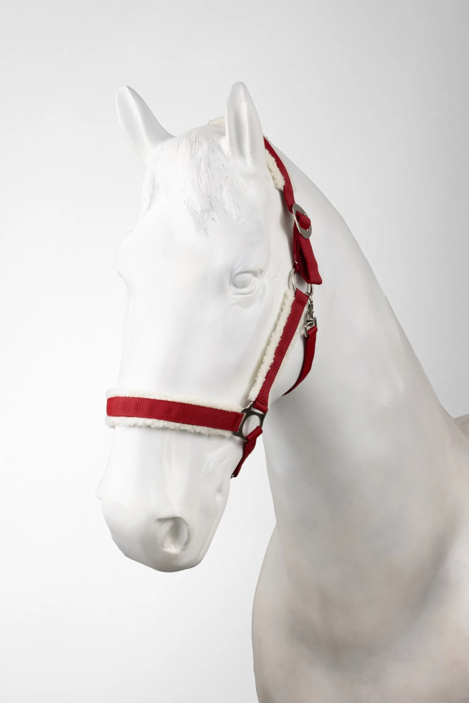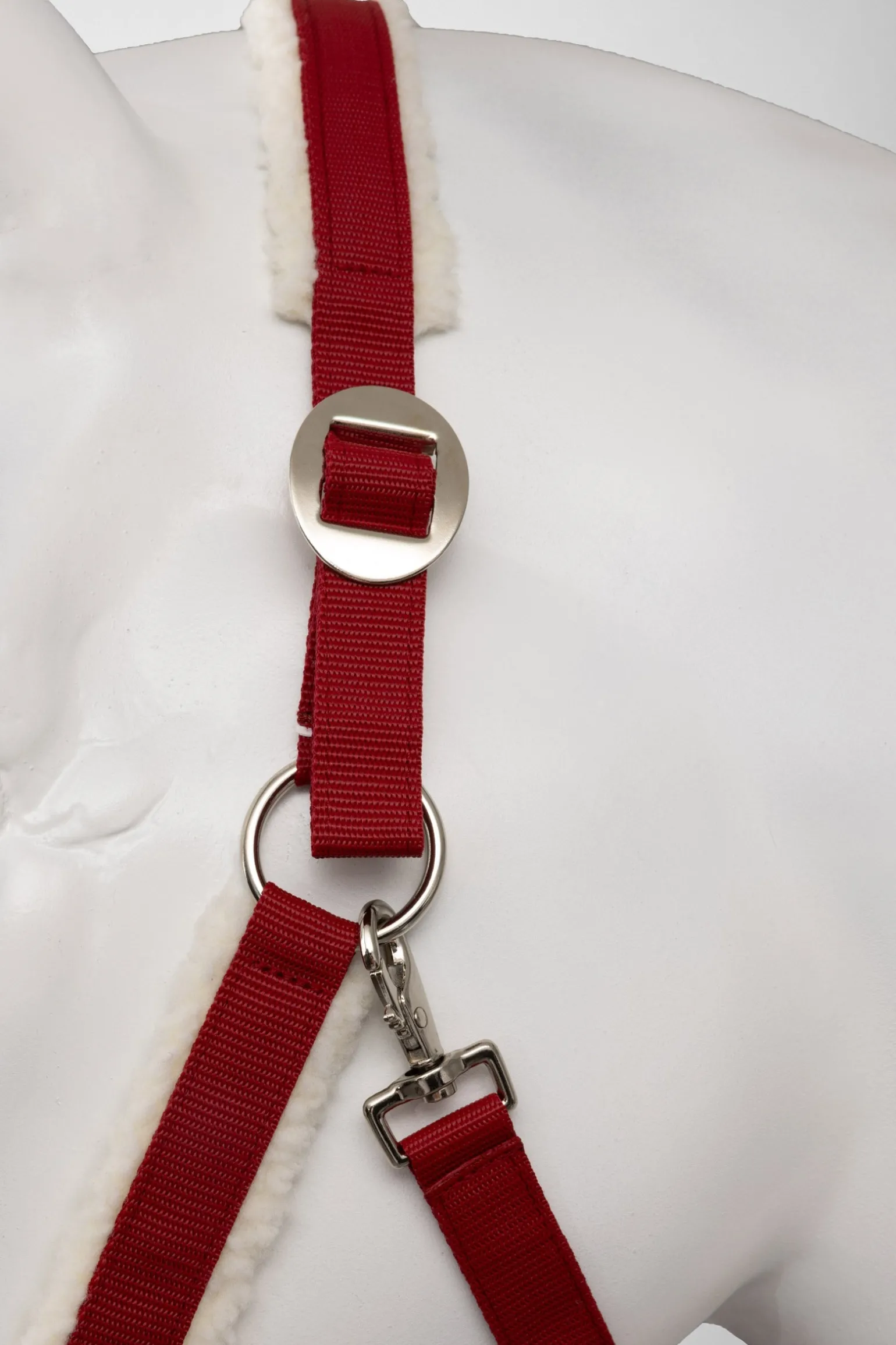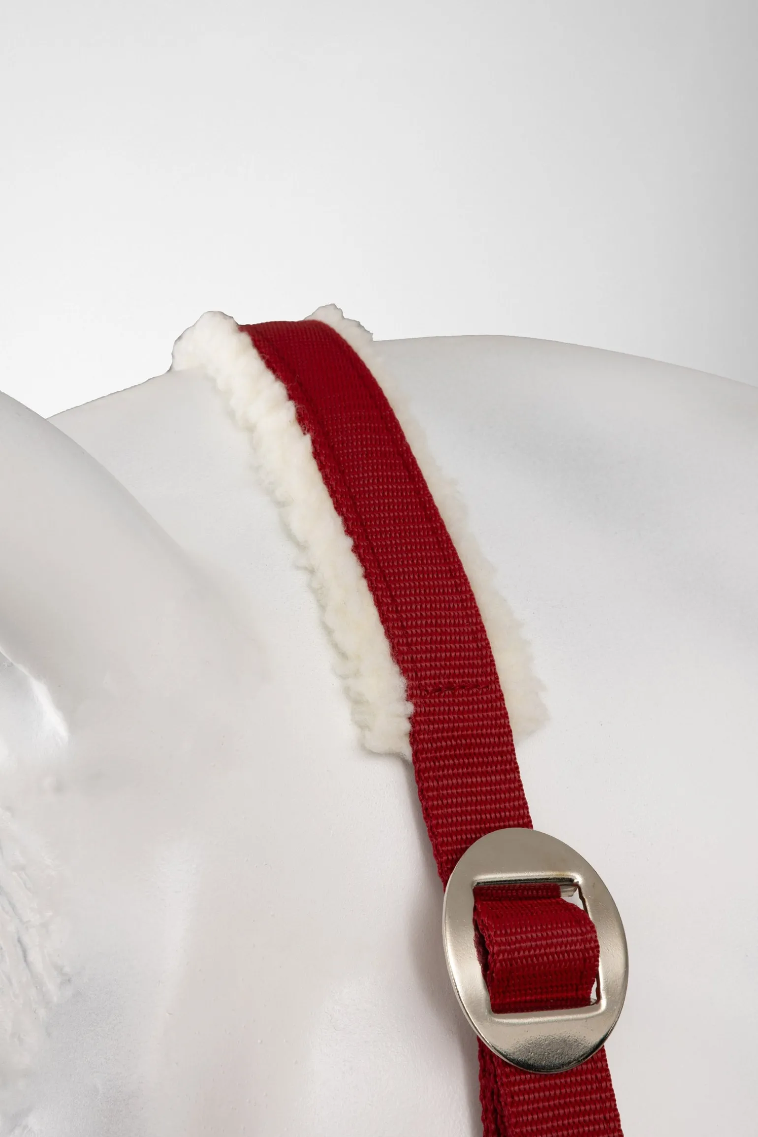 Diese niedliche festliche Halfter ist rot mit weißer Polsterung entlang Nase und Genick für einen weihnachtlichen Look. Genick, Nase und Seiten sind mit weichem Kunstfell gefüttert. Der Hals ist mit einem Karabinerhaken verstellbar.